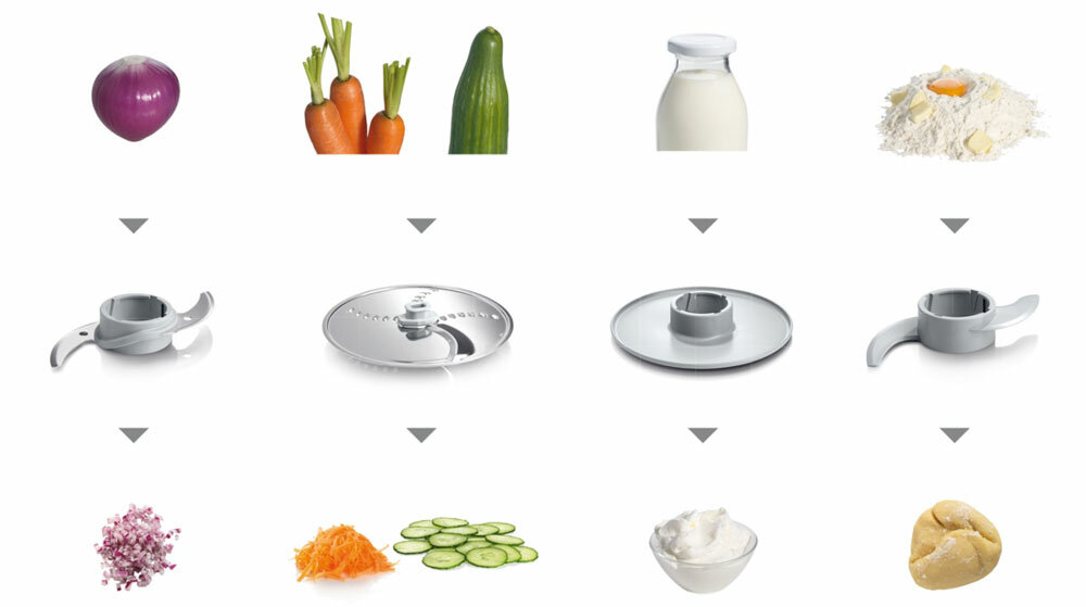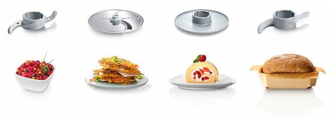 венчик для взбивания, для замешивания теста, насадка-терка, универсальный нож, Диск для взбивания, Диск-тёрка, Диск-шинковка, Для замешивания теста, Шинковка, Измельчитель, Нож-измельчитель, Шинковка, насадка для взбивания, насадка для нарезки ломтиками общее число насадок: 4, насадка для теста