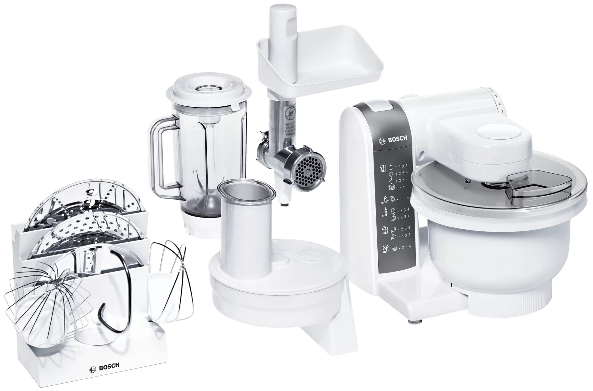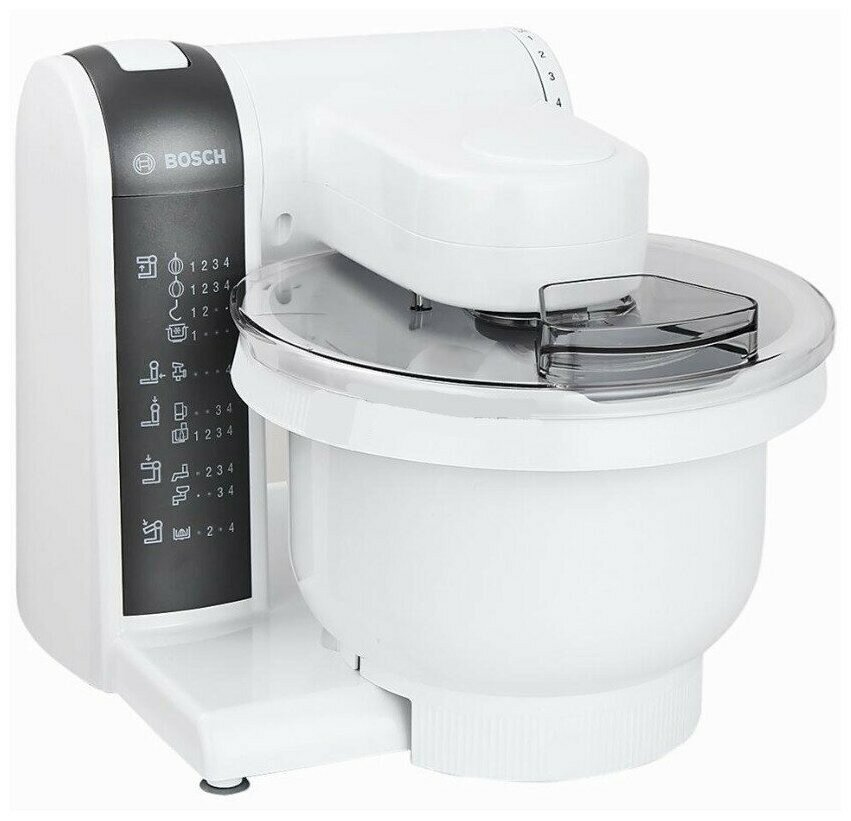 DVD диск с рецептами блюд; максимальная скорость вращения: 12250 об/мин; держатель для принадлежностей в комплекте; в чаше для замешивания можно замесить