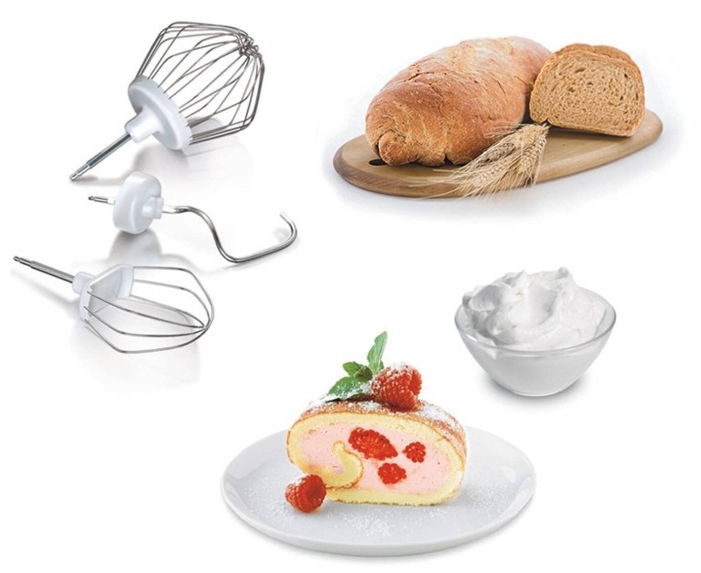 Венчик; Насадка для перемешивания; Крюк для теста; Кожух для защиты от брызг; Подставка для насадок; Инструкция
