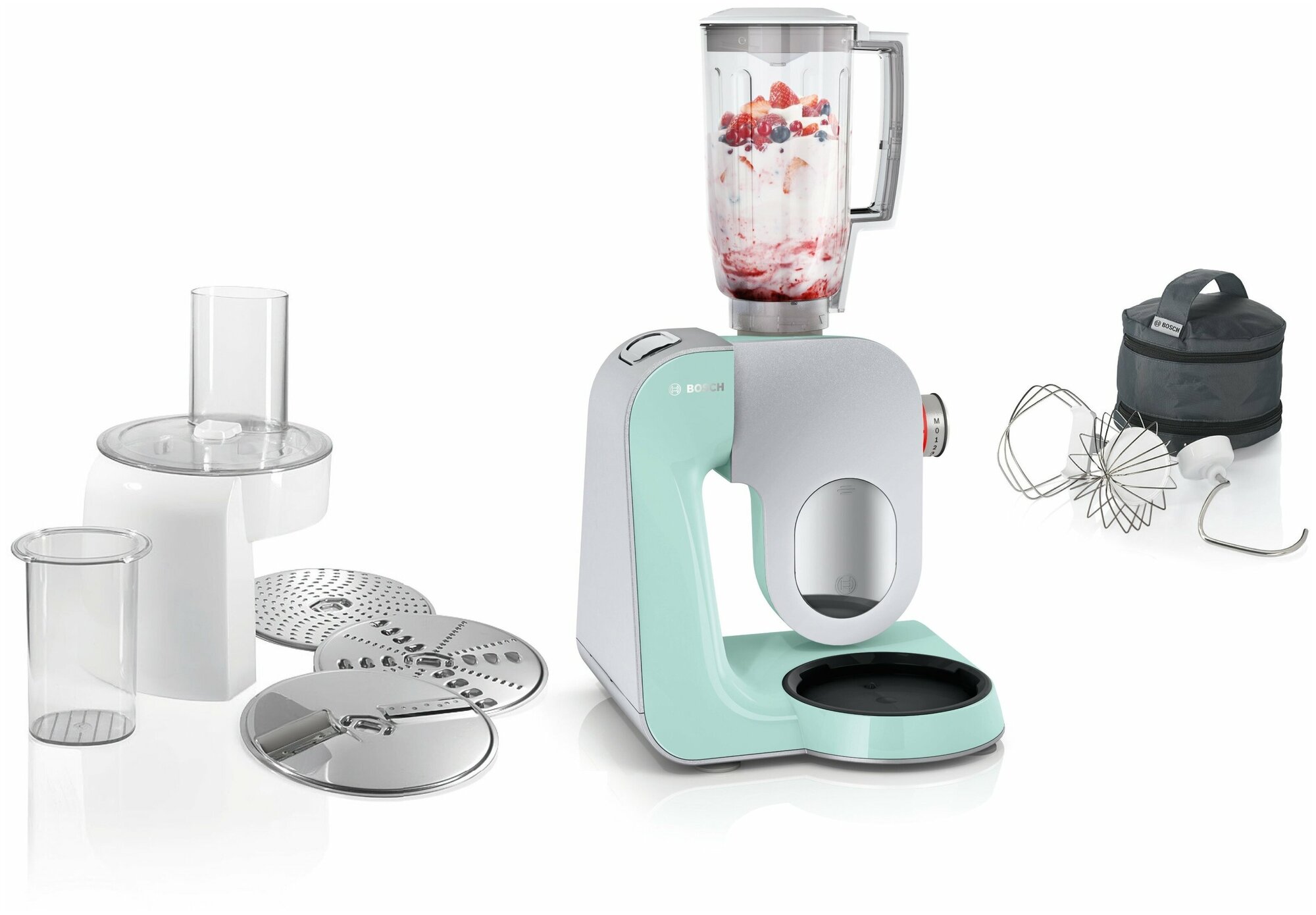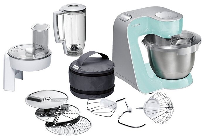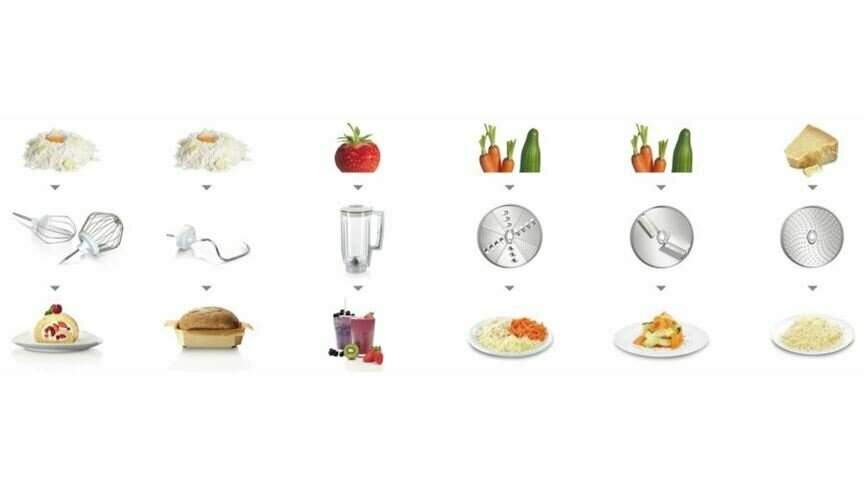 венчик для взбивания, для замешивания теста, насадка-терка, Для смешивания, Ломтерезка, Насадка-блендер, Шинковка, блендер, венчик для жидкого теста, диск для нарезки соломкой общее число насадок: 7, диск для шинковки, для взбивания, лопатка для перемешивания, насадка для взбивания, насадка для нарезки ломтиками, насадка для теста, овощерезка, тестомес
