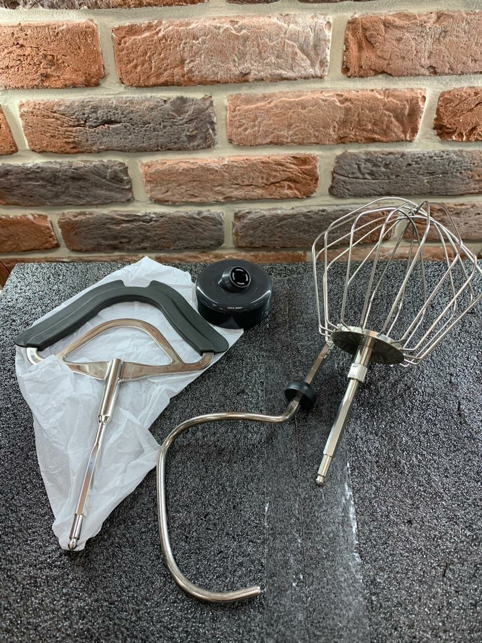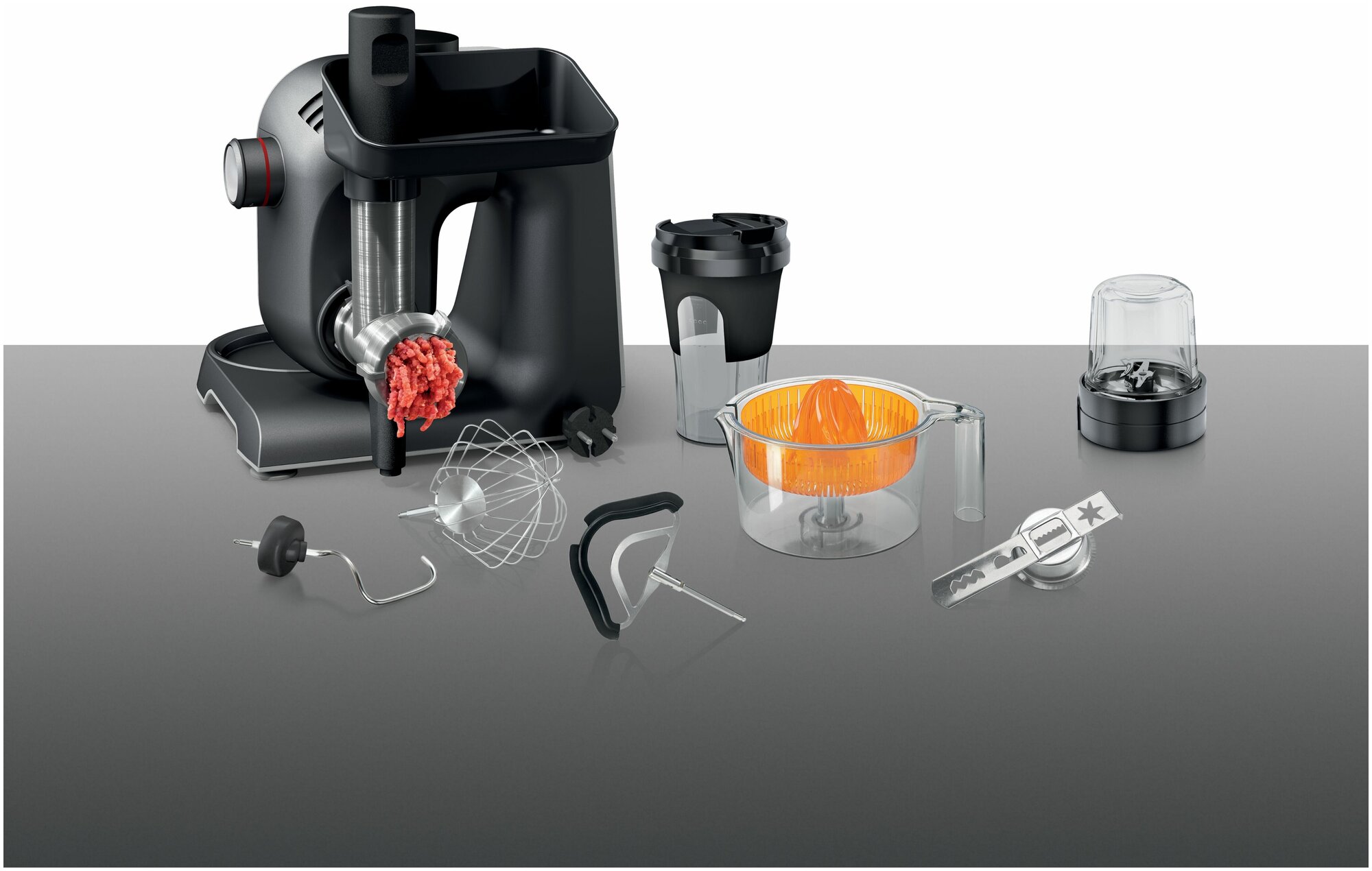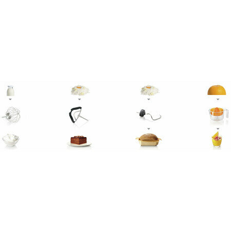Кухонная машина + - венчик с силиконовым покрытием; - объемный венчик для взбивания (с регулировкой высоты); - крюк для теста; - мультимиксер с универсальным ножом-крыльчаткой и 3 дисками для нарезки (5 функций): кусочками (крупными/мелкими), ломтиками (толстыми/тонкими) и стружкой; - мини-блендер (0,5л); - пресс для цитрусовых; - мясорубка; - измельчитель для овощей, зелени, пряных трав; - ZTA; - прозрачная крышка с загрузочным отверстием;