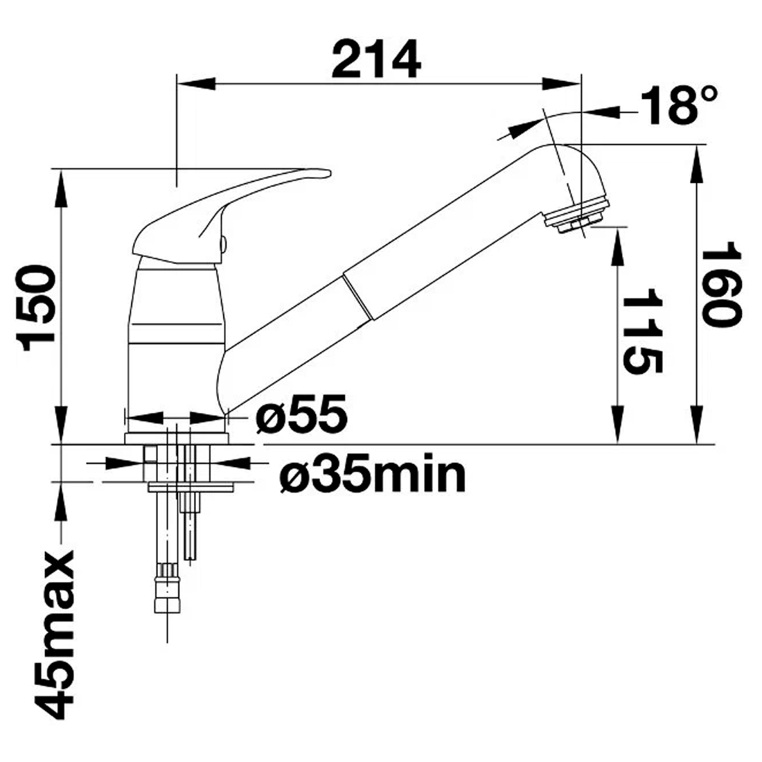 однорычажный смеситель, поворотный излив, требуется отверстие под смеситель Ø 35 мм, керамический дисковый картридж, легкое подключение гибкими шлангами длиной 350 мм с гайкой 1/2“, шланг выдвижного излива с нейлоновой оплеткой, возвратный клапан, предотвращающий возврат воды