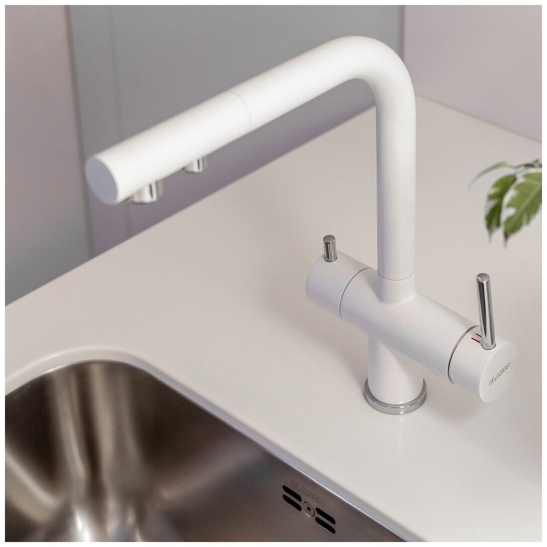 удобный 3-в-1-смеситель с рычагом холодной и горячей воды справа, и рычагом для фильтрованной воды слева; гигиеничный: отдельный излив с дополнительным носиком для фильтрованной воды - нет смешивания с водопроводной водой; компактность и практичность: с смесителем 2-в-1 не надо делать дополнительное отверстие для подачи фильтрованной воды; вращающийся на 360° излив для большей функциональности; превосходное сочетание смесителей в цвете с мойками и чашами из материала SILGRANIT и модели PVD сталь с мойками из нержавеющей стали; запатентованный рассекатель уменьшает отложения налета от воды; стабилизирующая пластина для увеличения устойчивости смесителя; максимальная толщина столешницы 60 мм; страна-производитель Германия