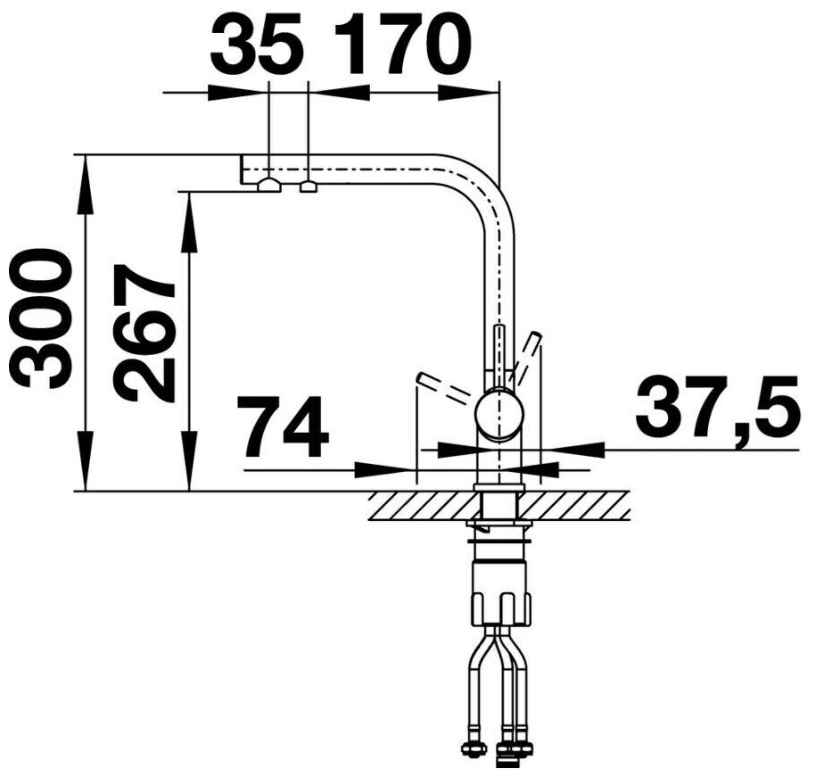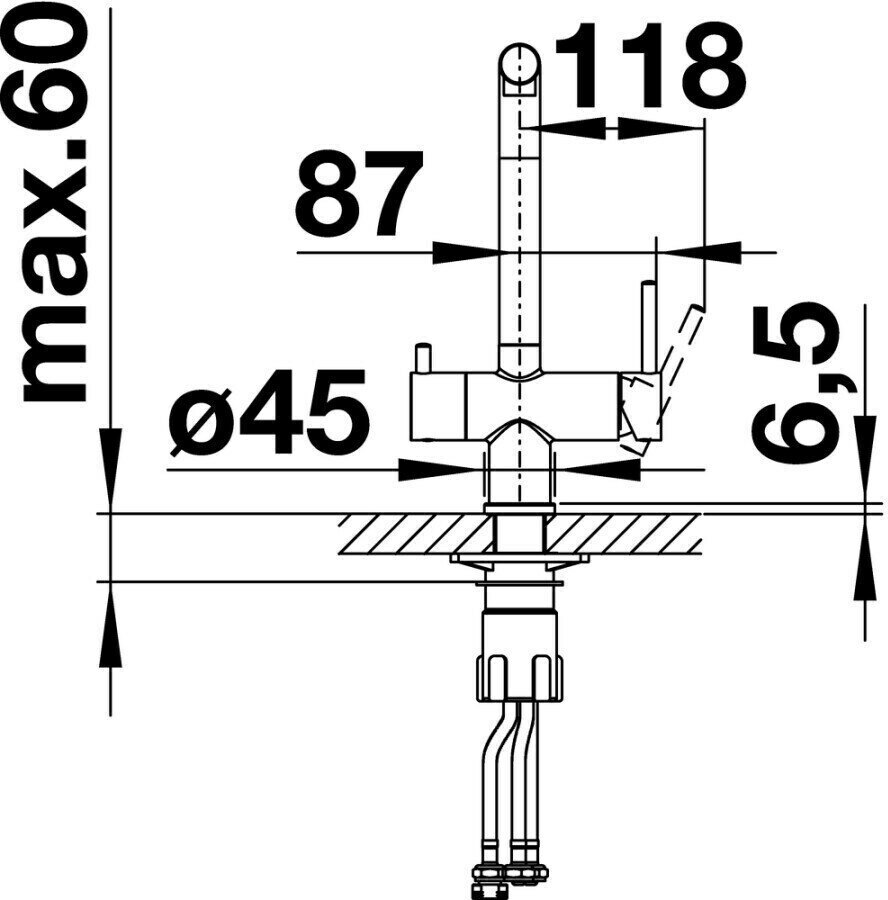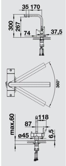 удобный 3-в-1-смеситель с рычагом холодной и горячей воды справа, и рычагом для фильтрованной воды слева; гигиеничный: отдельный излив с дополнительным носиком для фильтрованной воды - нет смешивания с водопроводной водой; компактность и практичность: с смесителем 2-в-1 не надо делать дополнительное отверстие для подачи фильтрованной воды; вращающийся на 360° излив для большей функциональности; превосходное сочетание смесителей в цвете с мойками и чашами из материала SILGRANIT и модели PVD сталь с мойками из нержавеющей стали; запатентованный рассекатель уменьшает отложения налета от воды; стабилизирующая пластина для увеличения устойчивости смесителя; максимальная толщина столешницы 60 мм; страна-производитель Германия