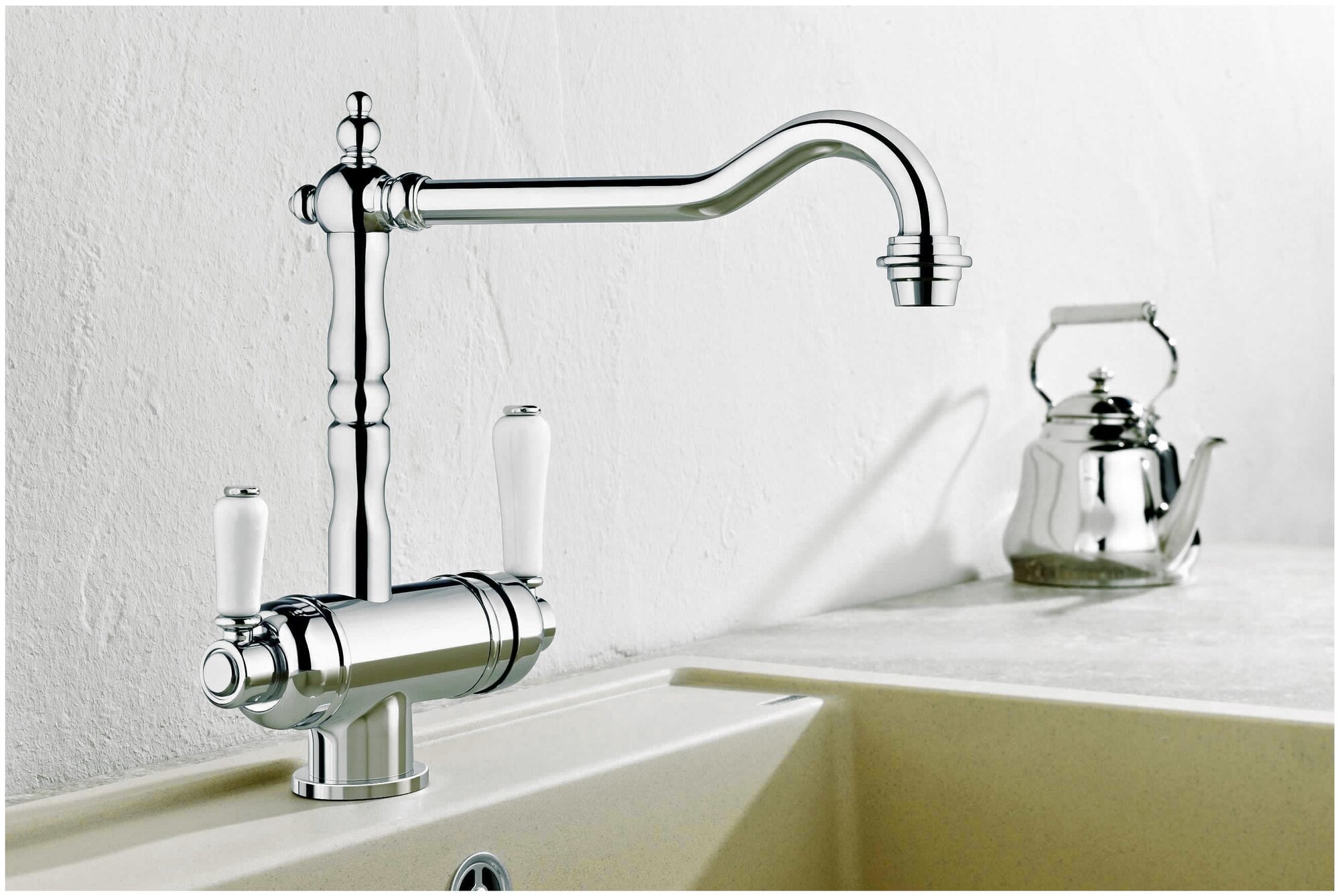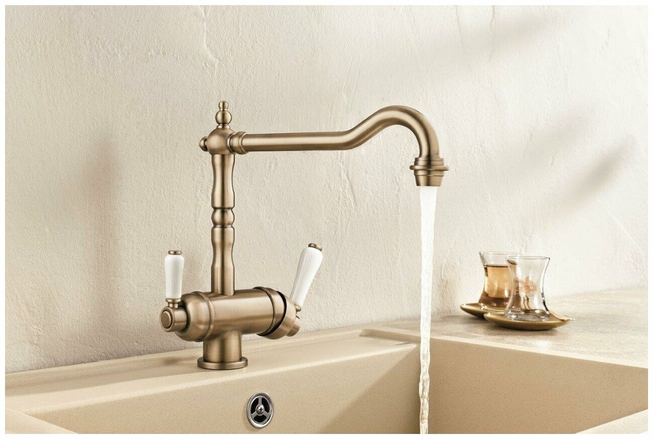 аэратор, встроенный фильтр, донный клапан, поворотный излив, система быстрого монтажа, С краном для питьевой воды