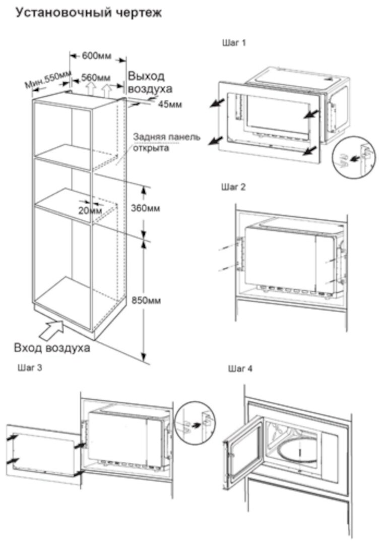 блокировка от детей, дисплей, подсветка камеры, Быстрый старт, Внутреннее освещение, Встроенные часы, Поворотный стол, При встраивании микроволновой печи в кухонную мебель учитывайте, Регулировка веса выпечки, Регулировка времени приготовления, С поворотным столом, Таймер, Часы, звуковой сигнал отключения, что рамка равномерно накрывает тор, что рамка равномерно накрывает торцы полок кухонного шкафа по 12 мм сверху и снизу