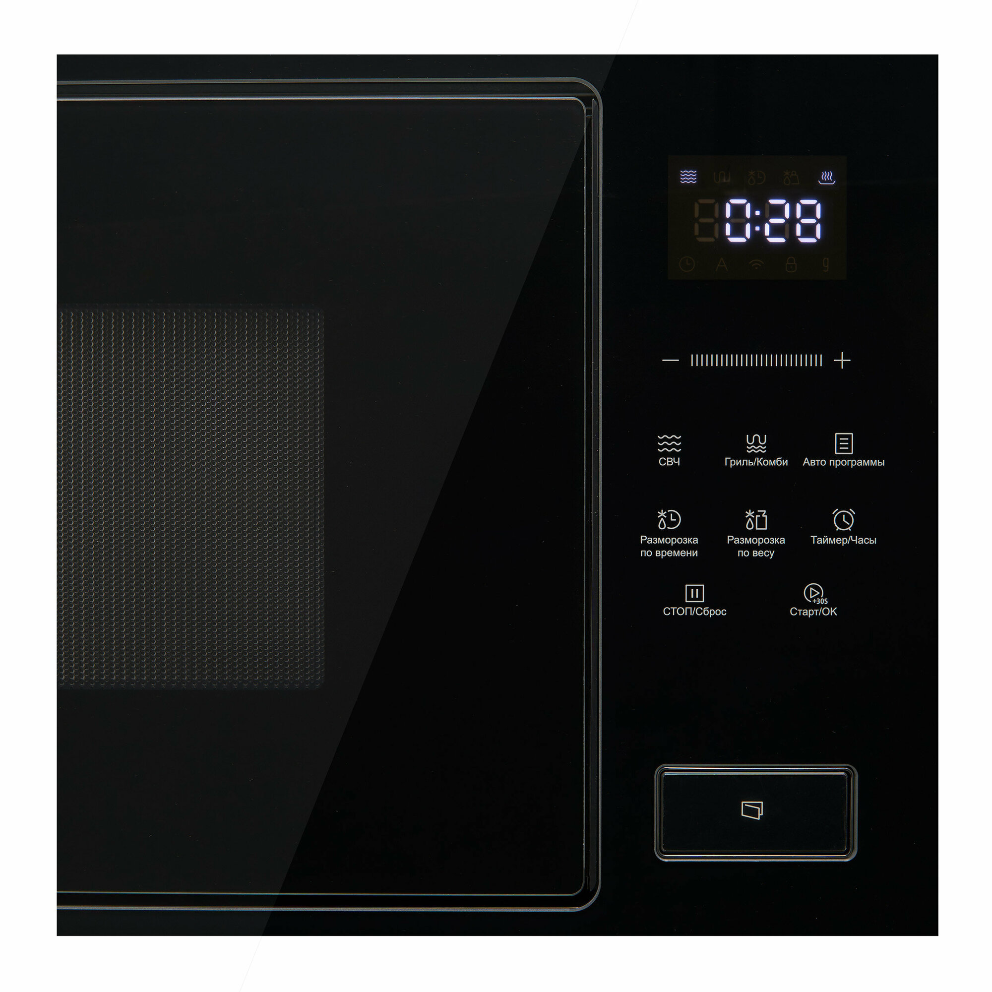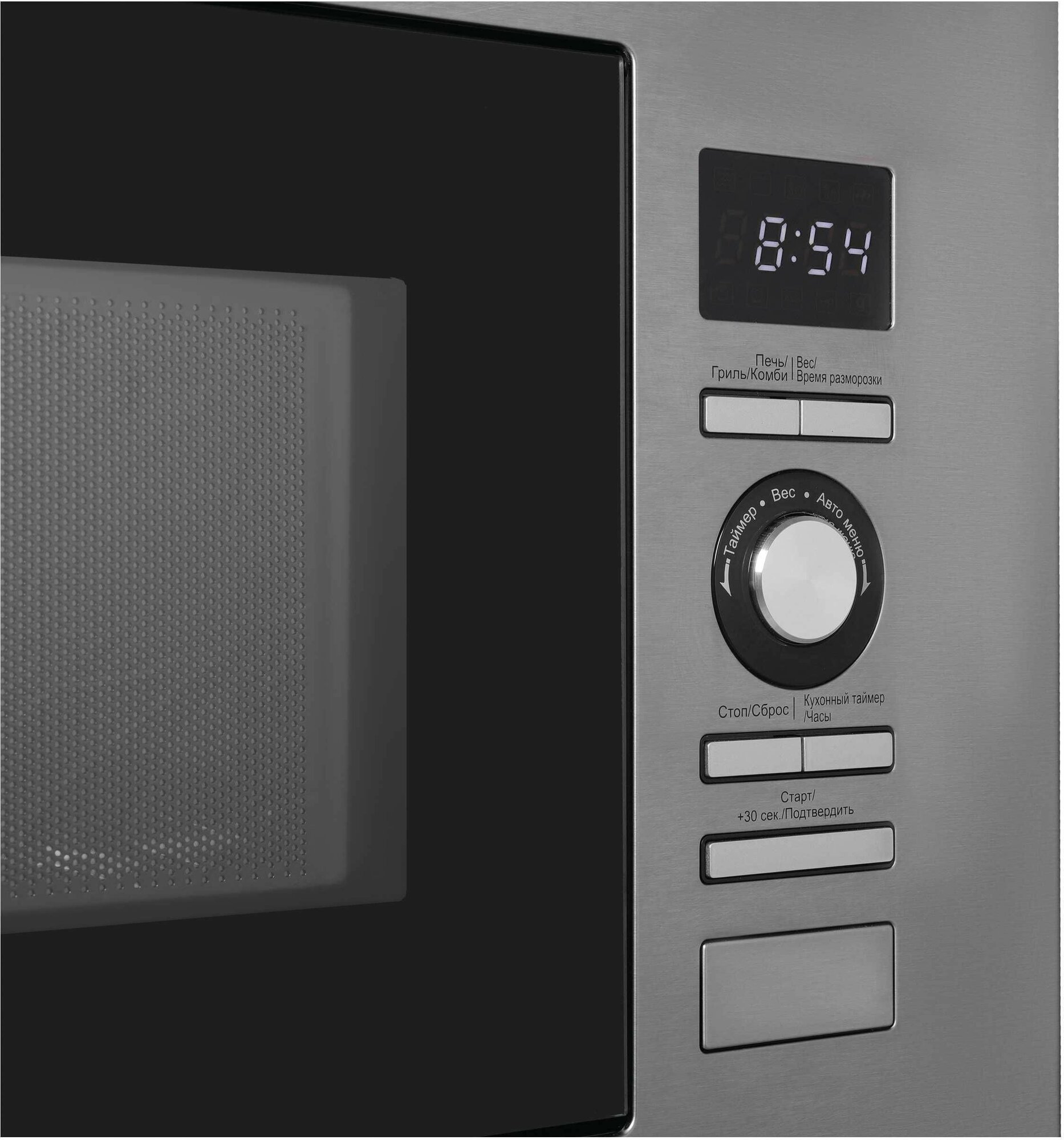 без поворотного стола, блокировка от детей, дисплей, кнопка +30 секунд, подсветка камеры, программирование рецептов в память