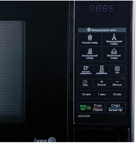 автоматическая разморозка, автоматический разогрев, автоматическое приготовление, звуковой сигнал отключения, программирование процесса приготовления, режим удаления запахов, ускоренная разморозка, ускоренный разогрев, дисплей, режим "международная кухня", система равномерного распределения микроволн, часы