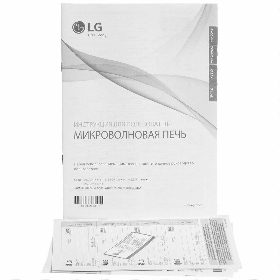 Инструкция, Микроволновая печь, Микроволновая печь - 1 шт, Микроволновая печь LG - MS2042DY Документация, Микроволновая печь; Руководство по эксплуатации, Руководство по эксплуатации, Руководство по эксплуатации., СВЧ-печь, без опций, гарантийный талон, документация, инструкция, инструкция по эксплуатации, микроволновая печь, поворотный стол, роликовое кольцо, руководство по эксплуатации, стеклянный поворотный стол, упаковочная коробка