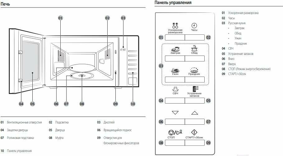 блокировка от детей, дисплей, кнопка +30 секунд, отключение звукового сигнала, подсветка камеры, система равномерного распределения микроволн, Автовыключение, Автоматические программы, Автоотключение, БИОкерамическое покрытие, БИОкерамическое покрытие - 10 лет гарантии, Внутреннее освещение, Кнопка Eco позволяет сэкономить до 40% электроэнергии в режиме ожидания., Отсрочка старта, Поворотный стол, Программирование рецептов, Режим энергосбережения, Рецепты русской кухни, С поворотным столом, Таймер, Функция +30 секунд, Часы, автоматическая разморозка, автоматическое приготовление, авторецепты, гриль, звуковой сигнал, режим разморозки, режим удаления запахов, решетка для гриля, таймер, функция устранения запахов, часы