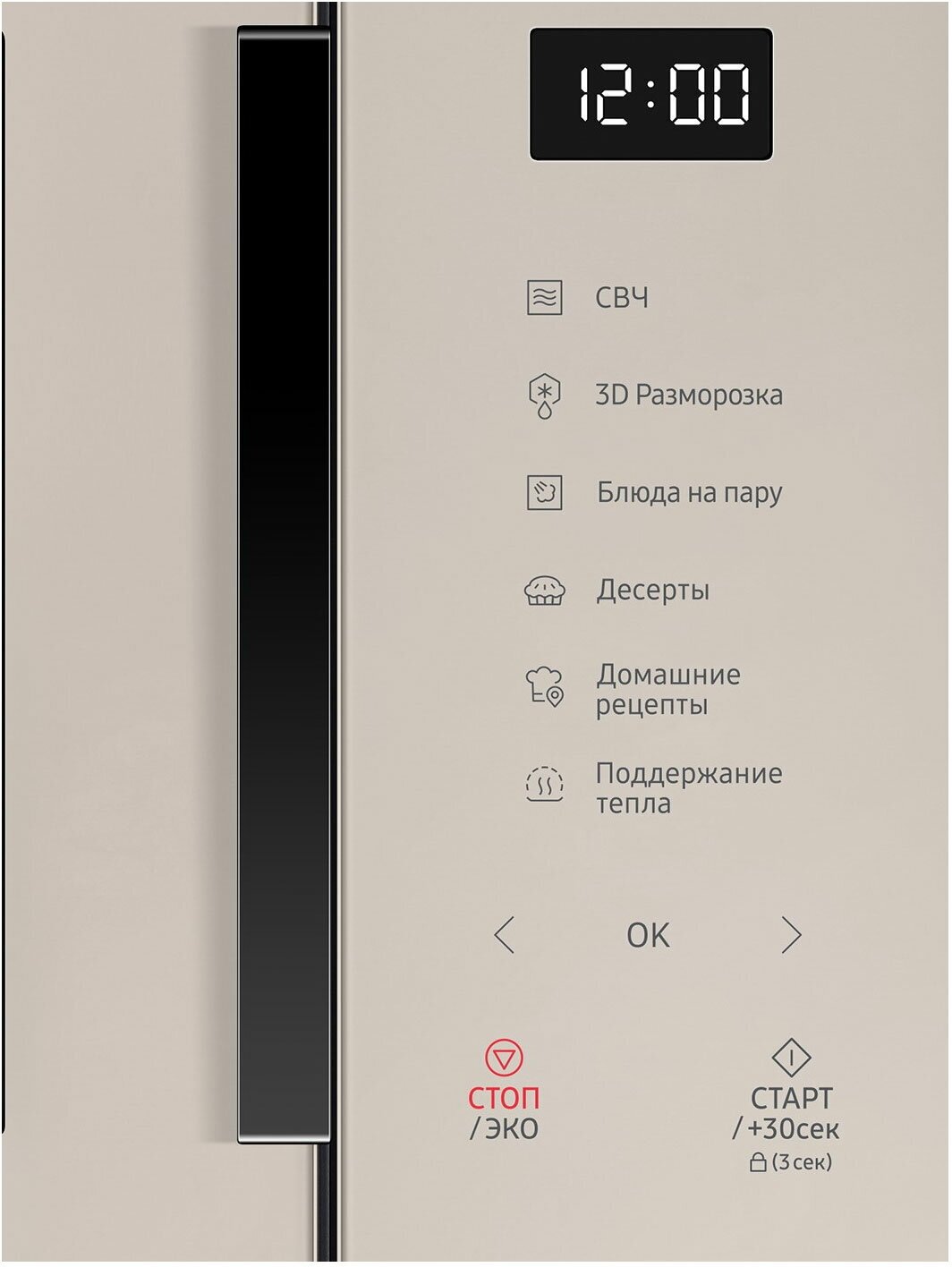 блокировка от детей, дисплей, кнопка +30 секунд, отключение звукового сигнала, подсветка камеры, система равномерного распределения микроволн