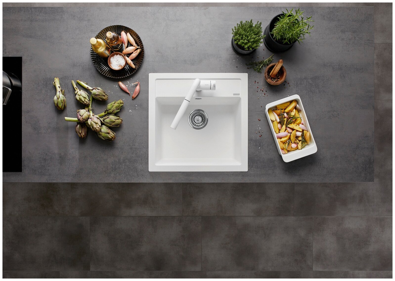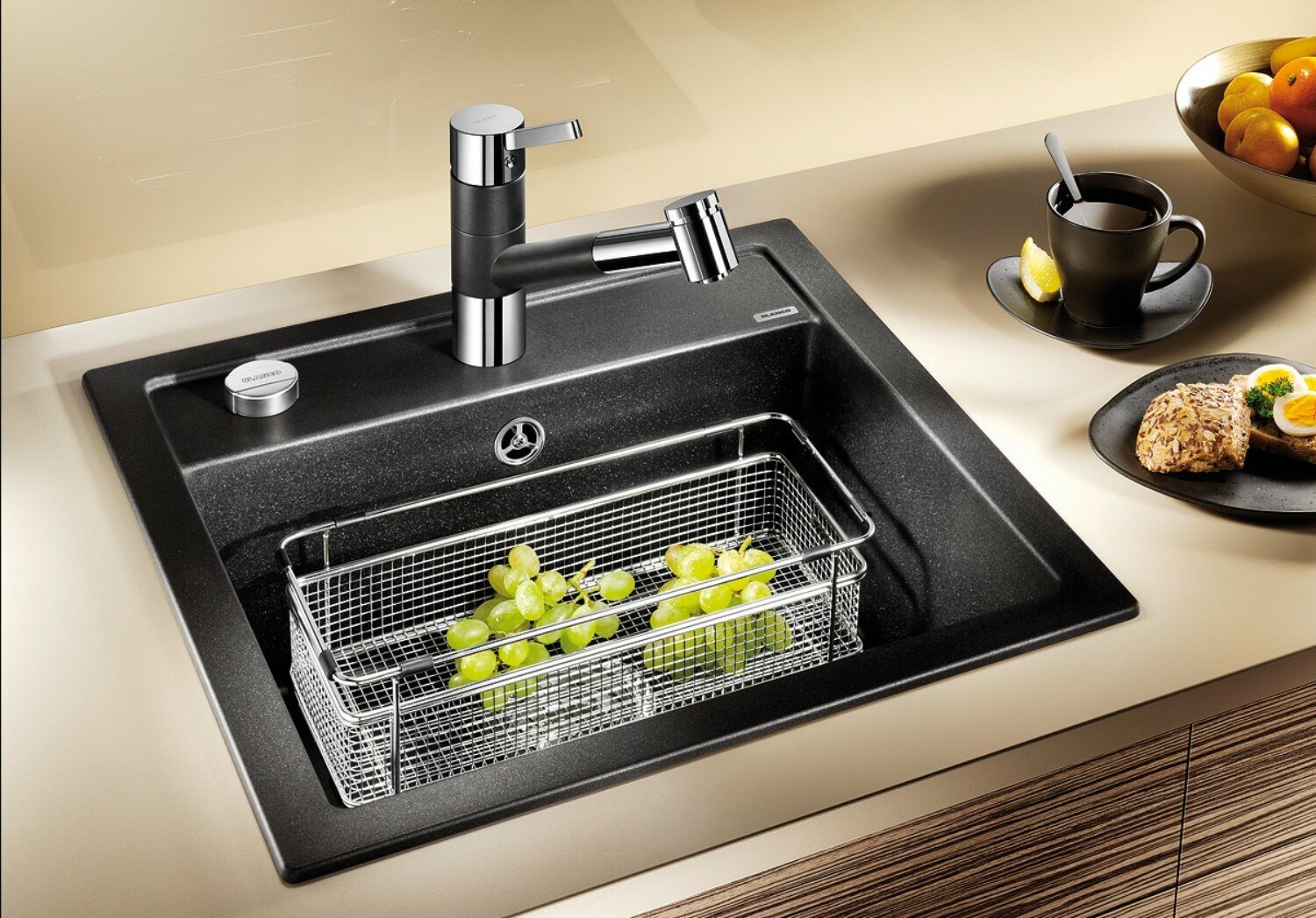 Без борта, Перелив, С сифоном, Сливной клапан, Специальный композитный материал состоит на 80 процентов из самого твердого компонента - гранита, что делает мойку устойчивой к появлению царапин. Материал мойки выдерживает высокие температуры.