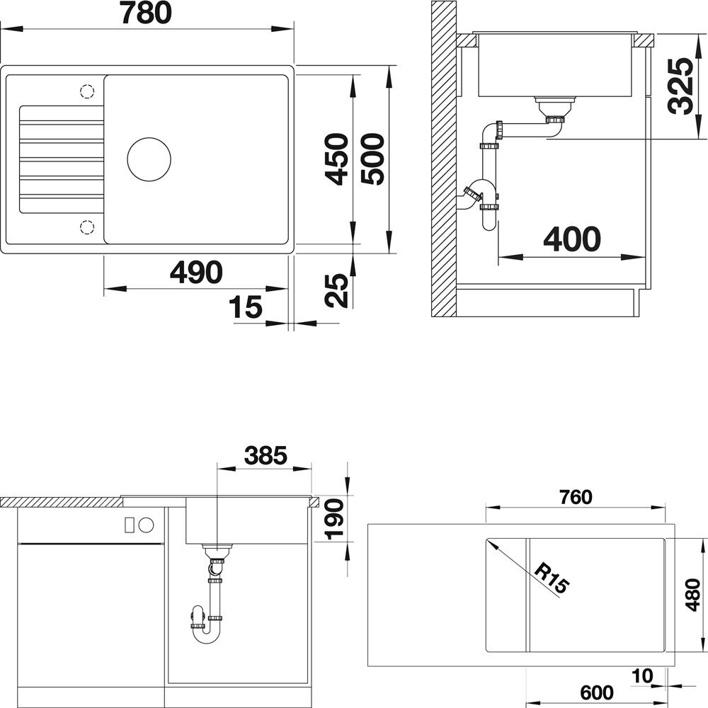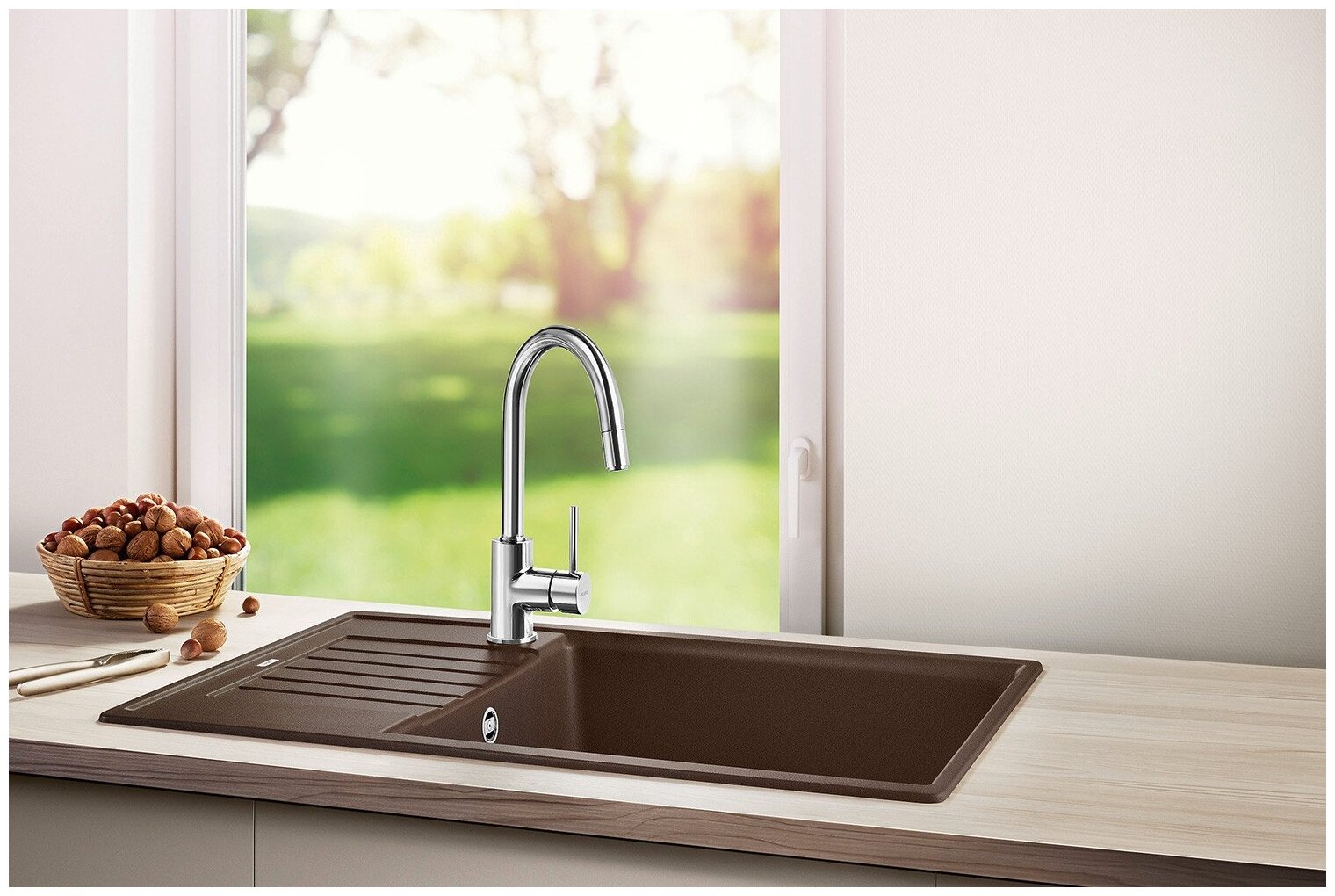прямолинейные контуры подчеркнуты узким кантом. очень просторная и глубокая основная чаша для мытья посуды больших размеров. компактный внешний размер благодаря уменьшенному крылу мойки. оборачиваемая мойка. искусственный камень Silgranit.