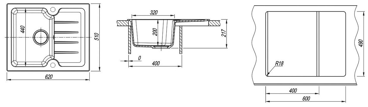 ПереливС сифоном, ПереливС сифономСливные желобки на крыле, корзинчатый вентиль, отверстие под смеситель, сливная арматура