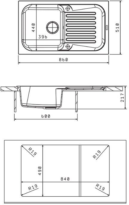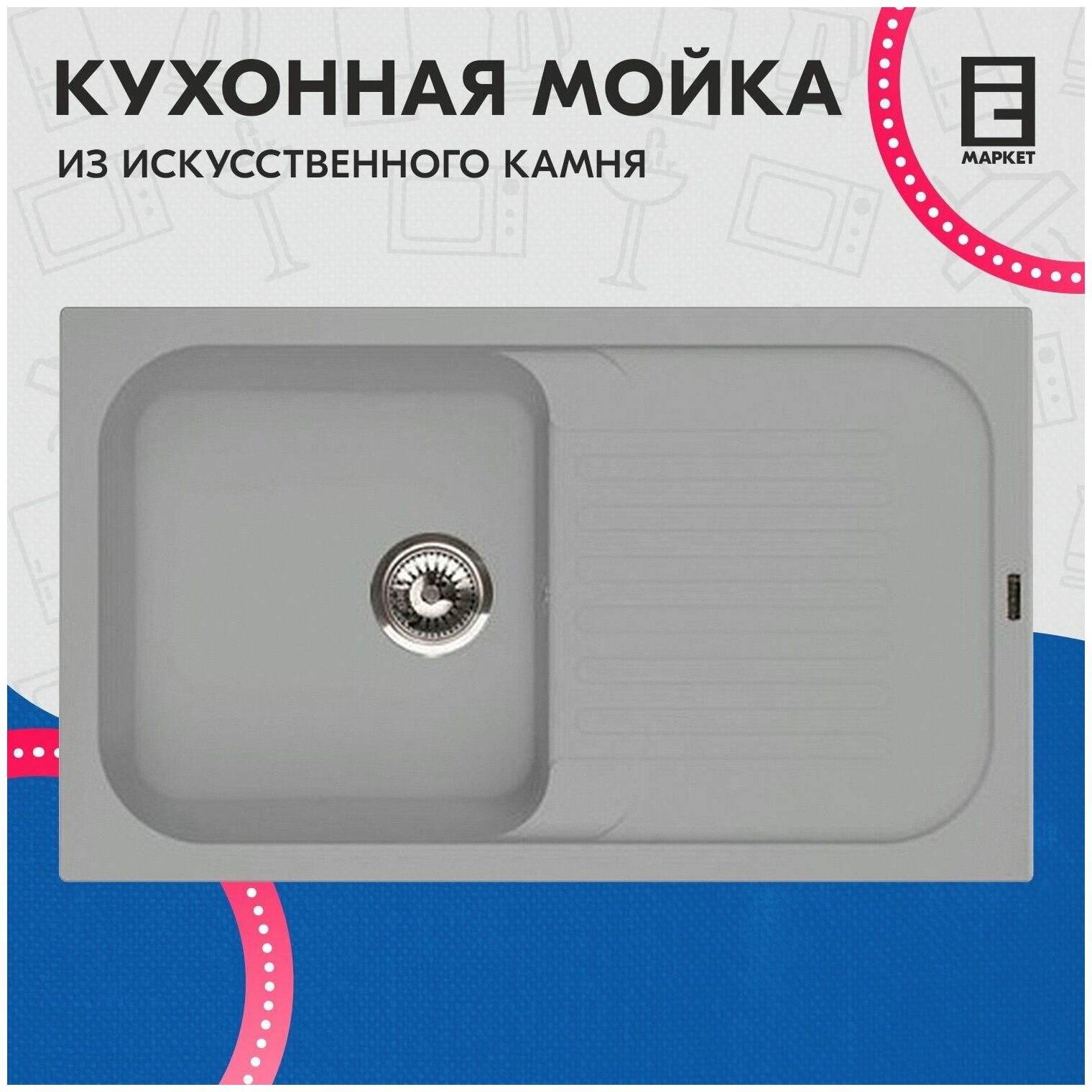 корзинчатый вентиль, отверстие под смеситель, сливная арматура, Отводная арматура с выпуском 3 ? ” (D=90 мм) и переливом, мойка