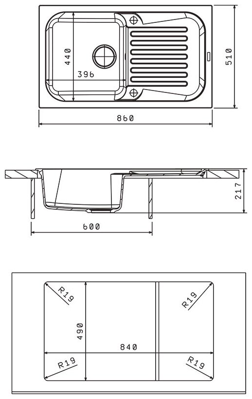 корзинчатый вентиль, отверстие под смеситель, сливная арматура, Отводная арматура с выпуском 3 ? ” (D=90 мм) и переливом, мойка
