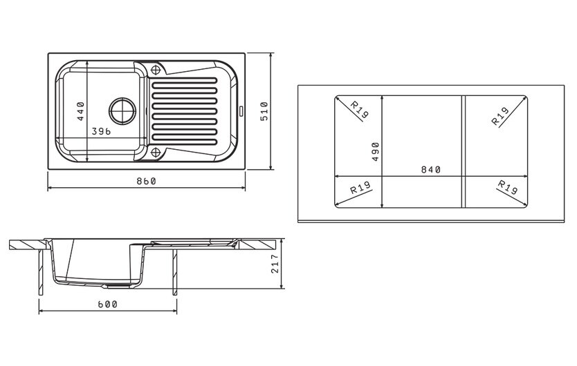корзинчатый вентиль, отверстие под смеситель, сливная арматура, Отводная арматура с выпуском 3 ? ” (D=90 мм) и переливом, мойка