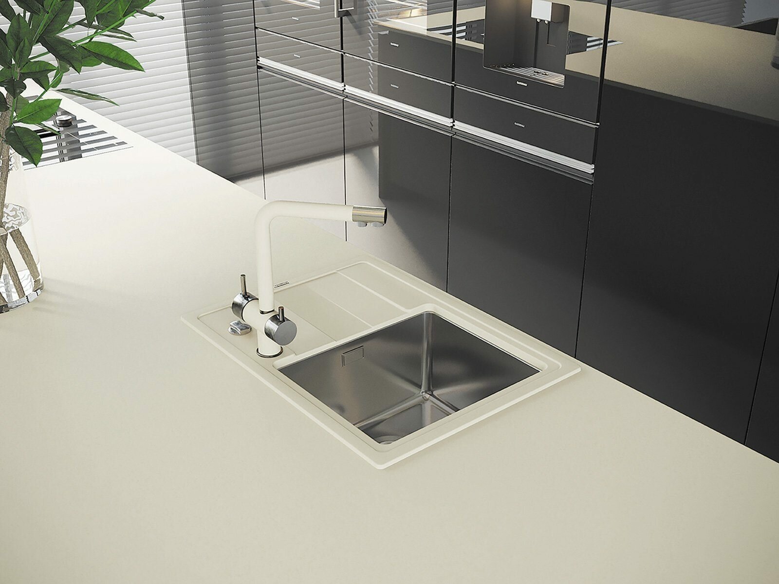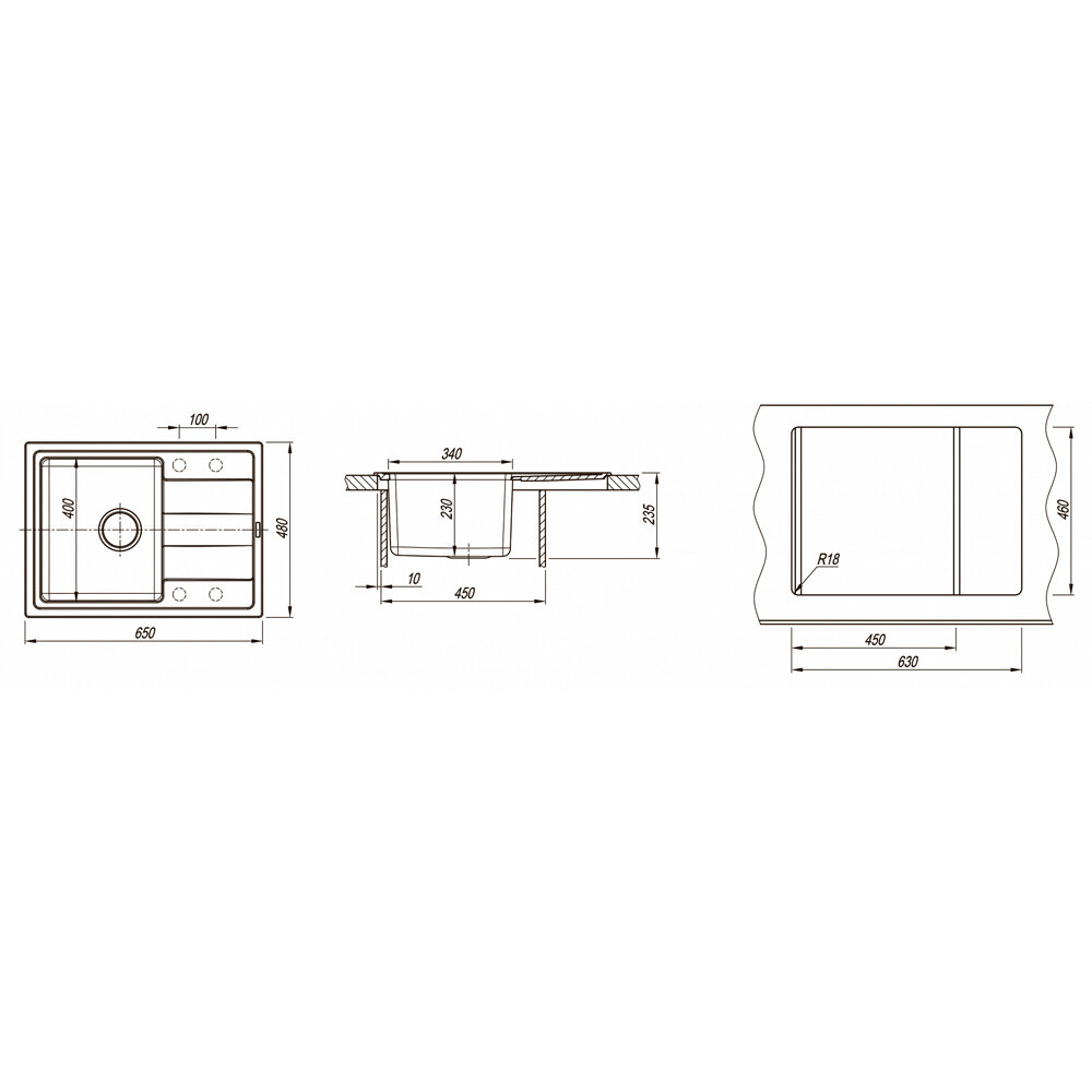 материал чаши мойки - нержавеющая сталь марки AISI 304, толщина 1 мм; в комплект входит отводная арматура с выпуском 3 ½ ” (D=90 мм) и переливом, набор крепежей, трафарет