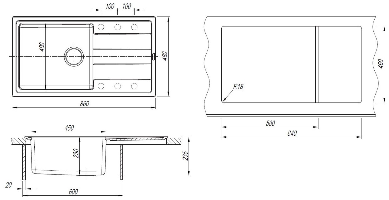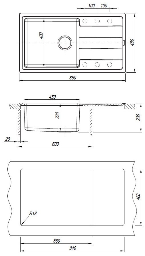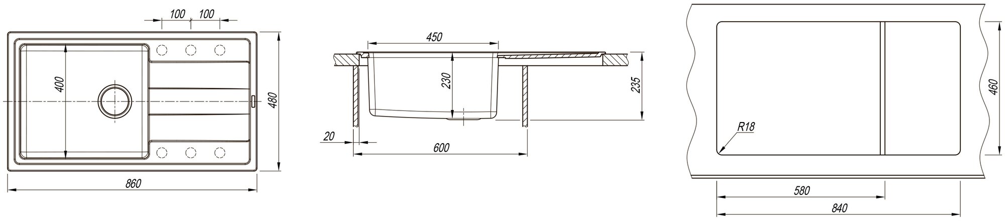 Сливные желобки на крылеПереливС сифоном, корзинчатый вентиль, отверстие под смеситель, сливная арматура