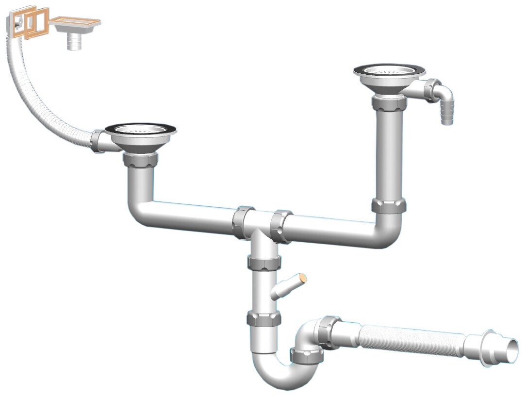 корзинчатый вентиль, сливная арматура, Отводная арматура для двух разноуровневых чаш с выпусками 3 ? ” (D=90мм) и переливом (Комби), Отводная арматура для двух разноуровневых чаш с выпусками 3 ½ ” (D=90мм) и переливом (Комби)
