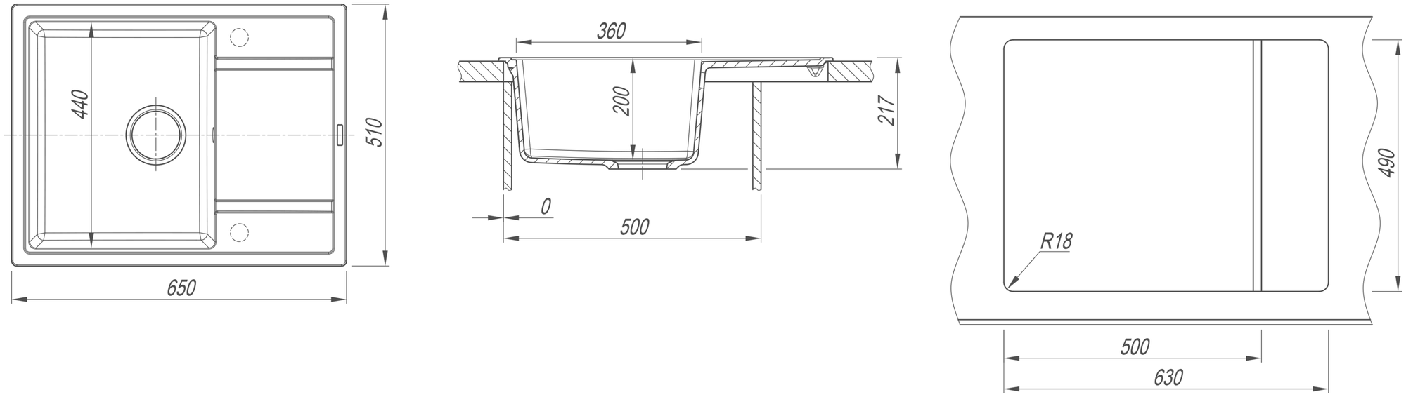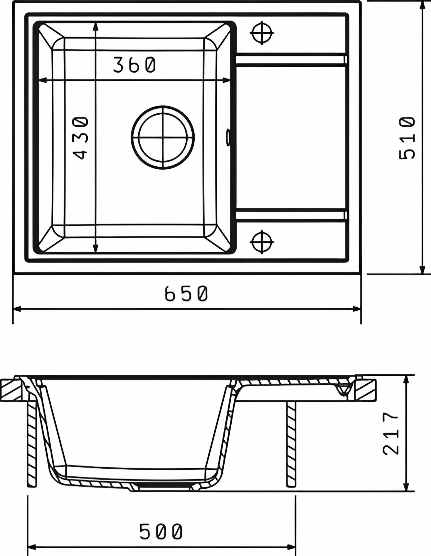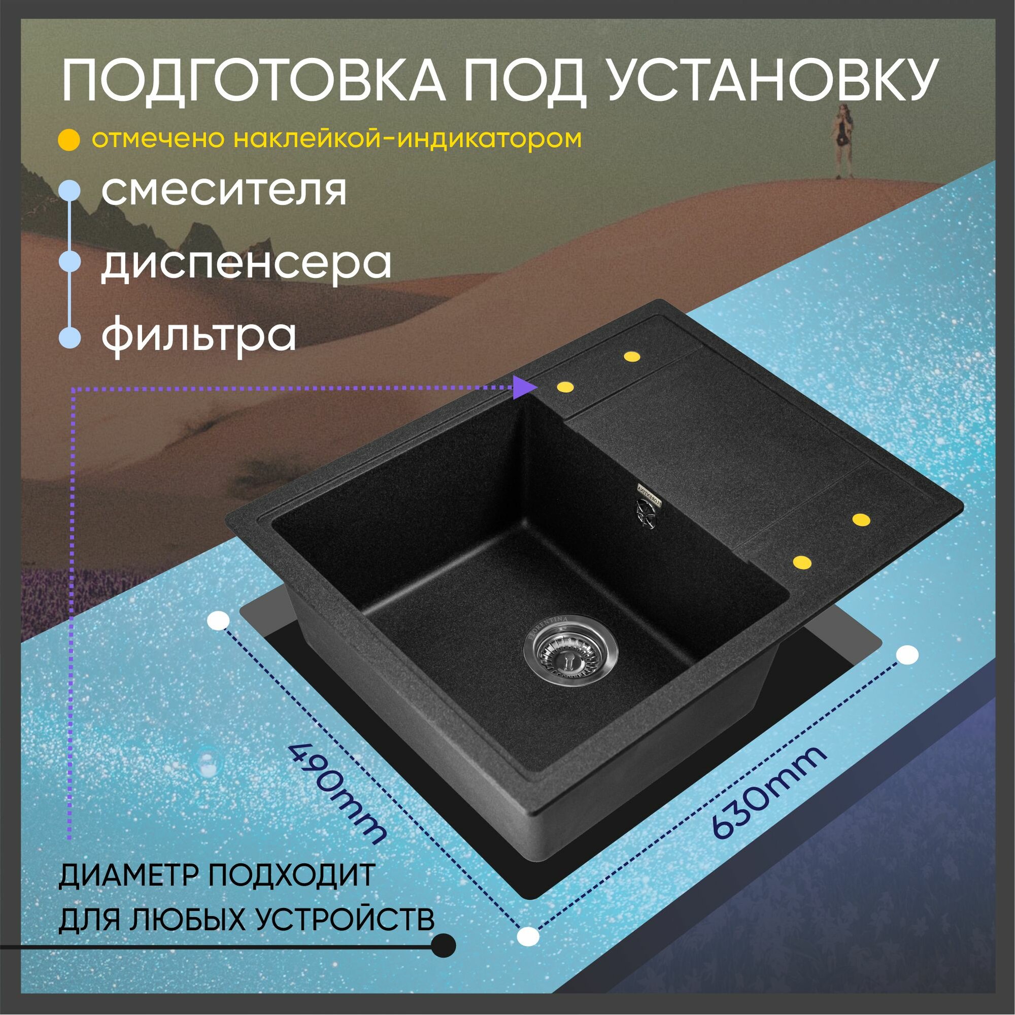 корзинчатый вентиль, отверстие под смеситель, сливная арматура, В комплект входит отводная арматура с выпуском 3 1/2" (D=90мм) и переливом, мойка, набор крепежей и трафарет.