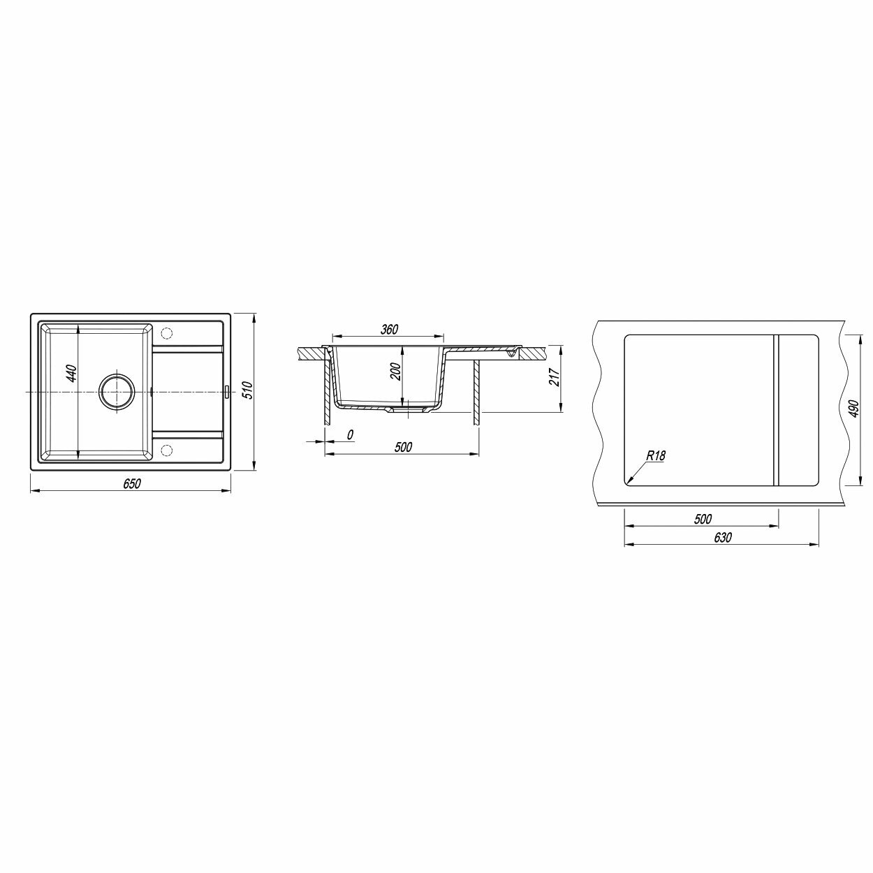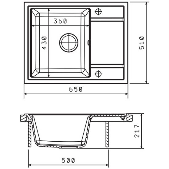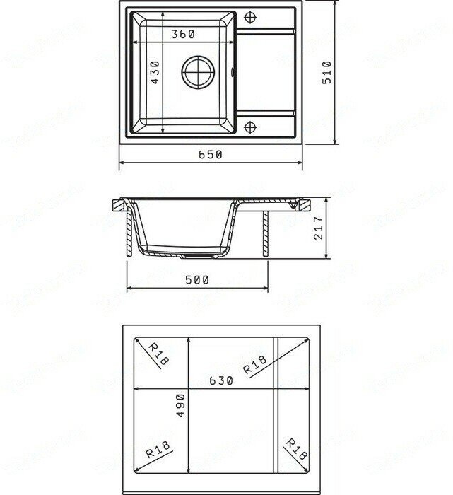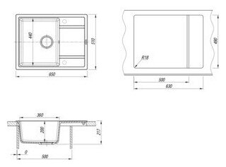 корзинчатый вентиль, отверстие под смеситель, сливная арматура, В комплект входит отводная арматура с выпуском 3 1/2" (D=90мм) и переливом, мойка, набор крепежей и трафарет.
