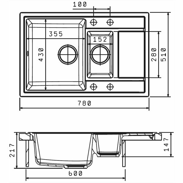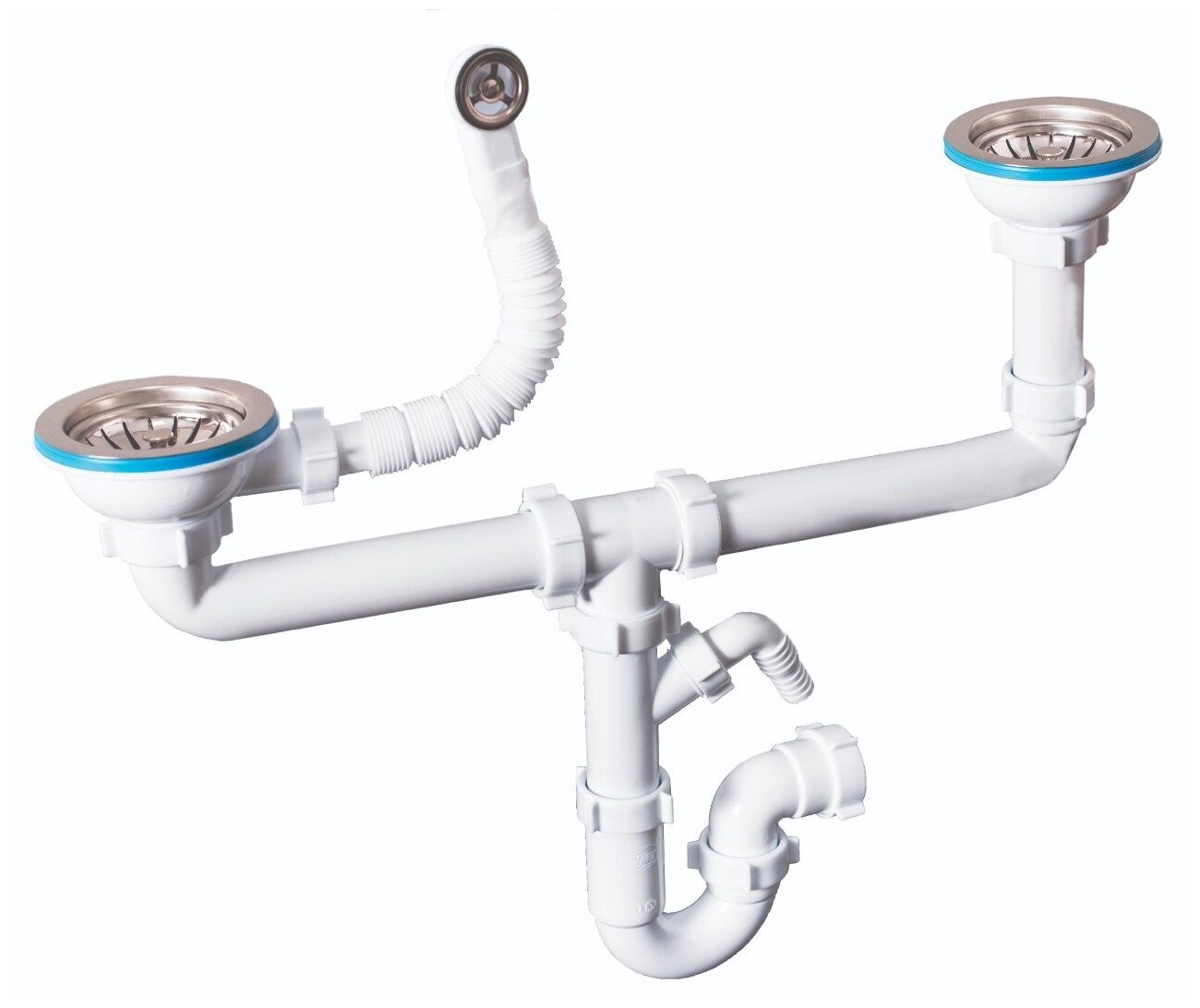 корзинчатый вентиль, крепеж, отверстие под смеситель, сливная арматура, Отводная арматура для двух разноуровневых чаш с выпусками 3 ? ” (D=90мм) и переливом, Отводная арматура для двух разноуровневых чаш с выпусками 3 ½ ” (D=90мм) и переливом, документация, мойка