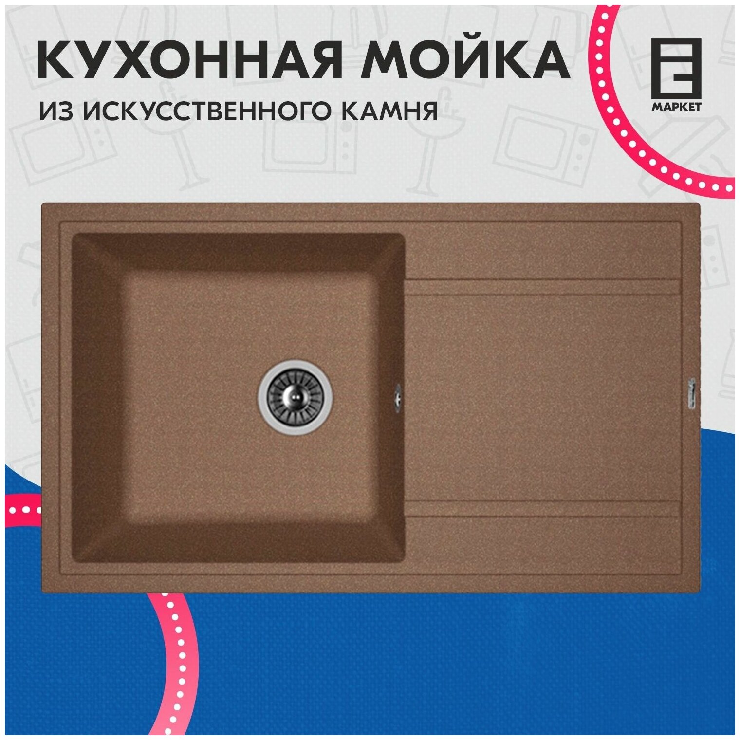 корзинчатый вентиль, отверстие под смеситель, сливная арматура, Отводная арматура с выпуском 3 ? ” (D=90 мм) и переливом, мойка