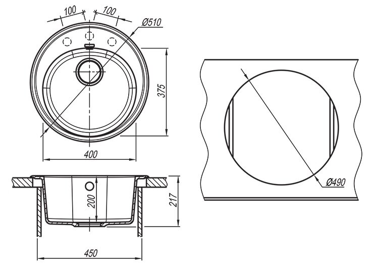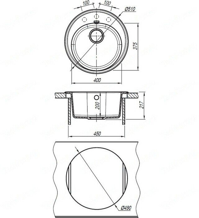 корзинчатый вентиль, отверстие под смеситель, сливная арматура, В комплект входит отводная арматура с выпуском 3 1/2" (D=90мм) и переливом, набор крепежей и трафарет.