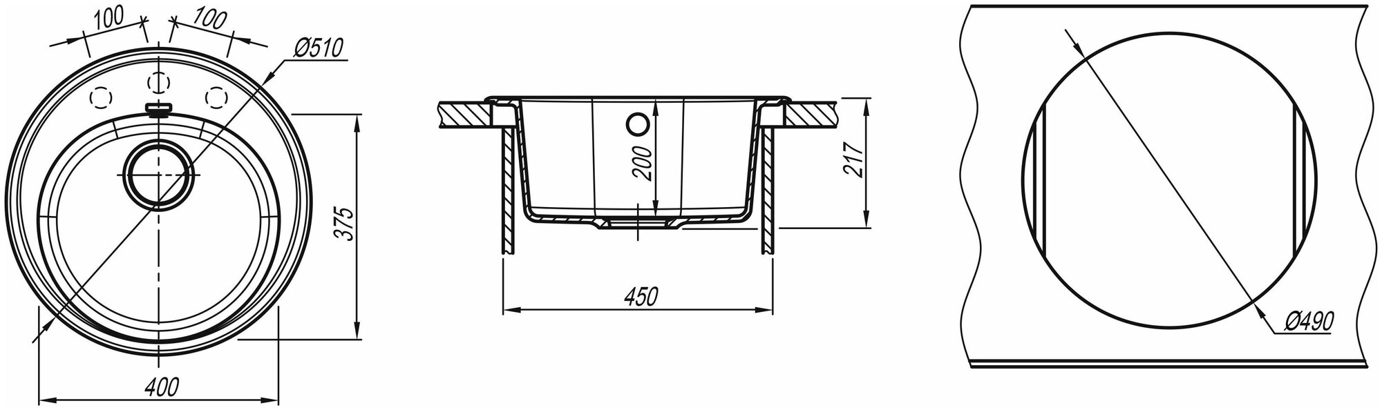 корзинчатый вентиль, отверстие под смеситель, сливная арматура, В комплект входит отводная арматура с выпуском 3 1/2" (D=90мм) и переливом, Отводная арматура с выпуском 3 ½ ” (D=90 мм) и переливом, набор крепежей и трафарет.