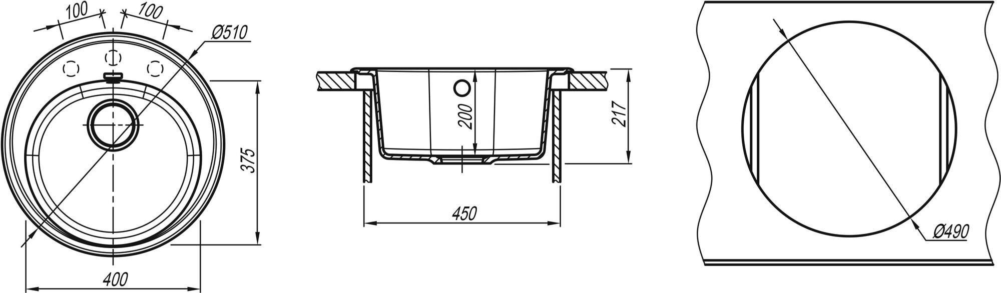 корзинчатый вентиль, отверстие под смеситель, сливная арматура, В комплект входит отводная арматура с выпуском 3 1/2" (D=90мм) и переливом, Отводная арматура с выпуском 3 ½ ” (D=90 мм) и переливом, набор крепежей и трафарет.