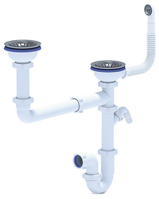 корзинчатый вентиль, сливная арматура, Отводная арматура для двух разноуровневых чаш с выпусками 3 ? ” (D=90мм) и переливом