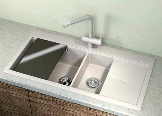 корзинчатый вентиль, отверстие под смеситель, разделочная доска, сливная арматура, мойка