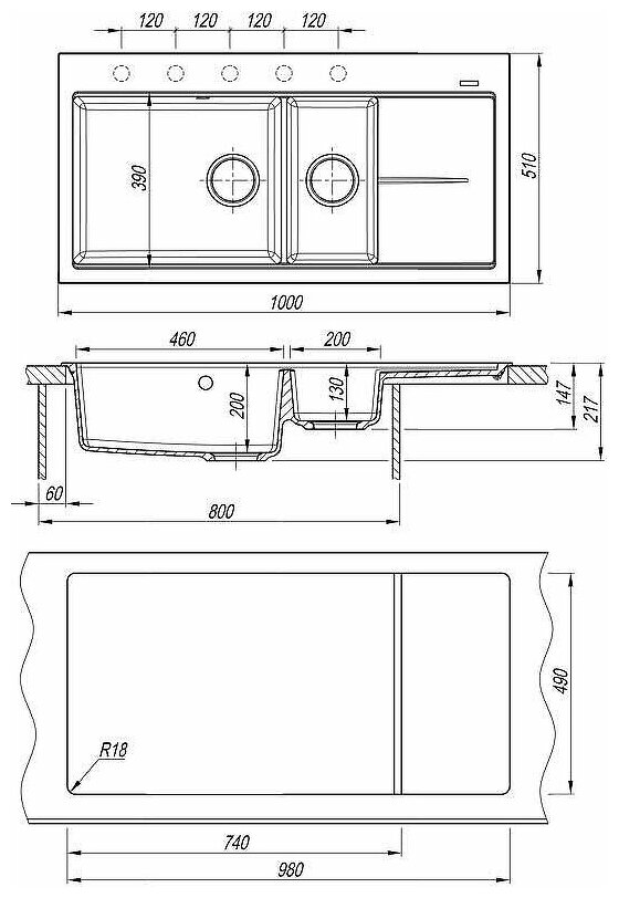 дополнительная чаша, корзинчатый вентиль, отверстие под смеситель, сливная арматура