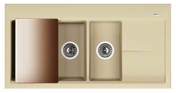 корзинчатый вентиль, разделочная доска, сливная арматура, Отводная арматура для двух разноуровневых чаш с выпусками 3 ? ” (D=90мм) и переливом, мойка