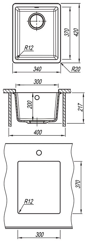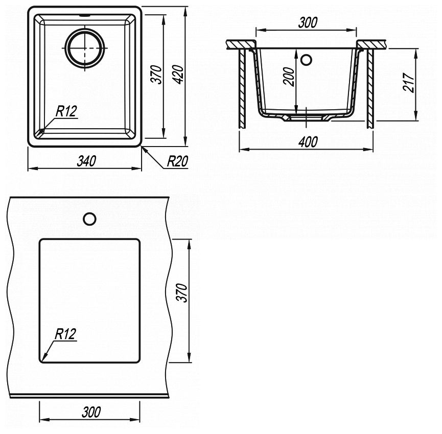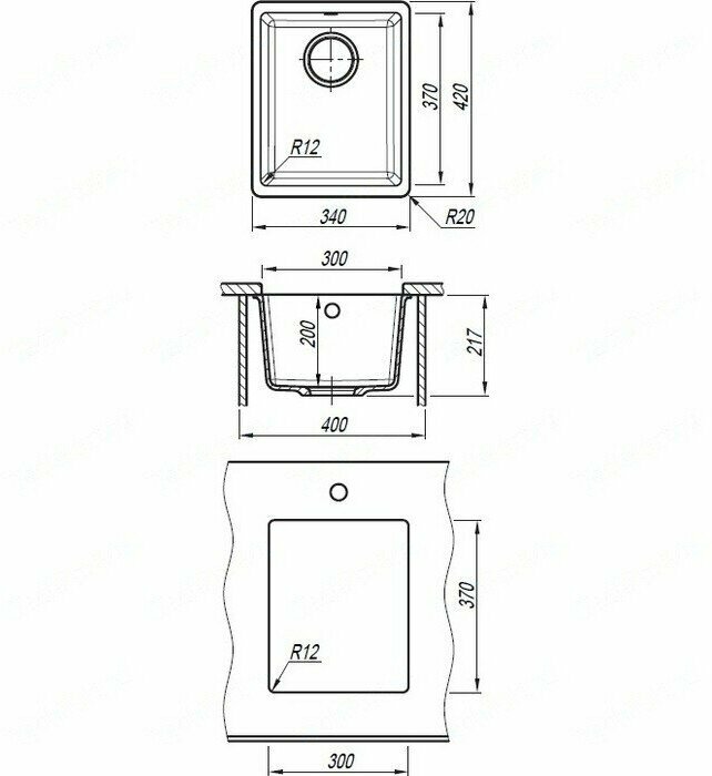 корзинчатый вентиль, отверстие под смеситель, сливная арматура, Отводная арматура с выпуском 3 ? ” (D=90 мм) и переливом, документация, мойка