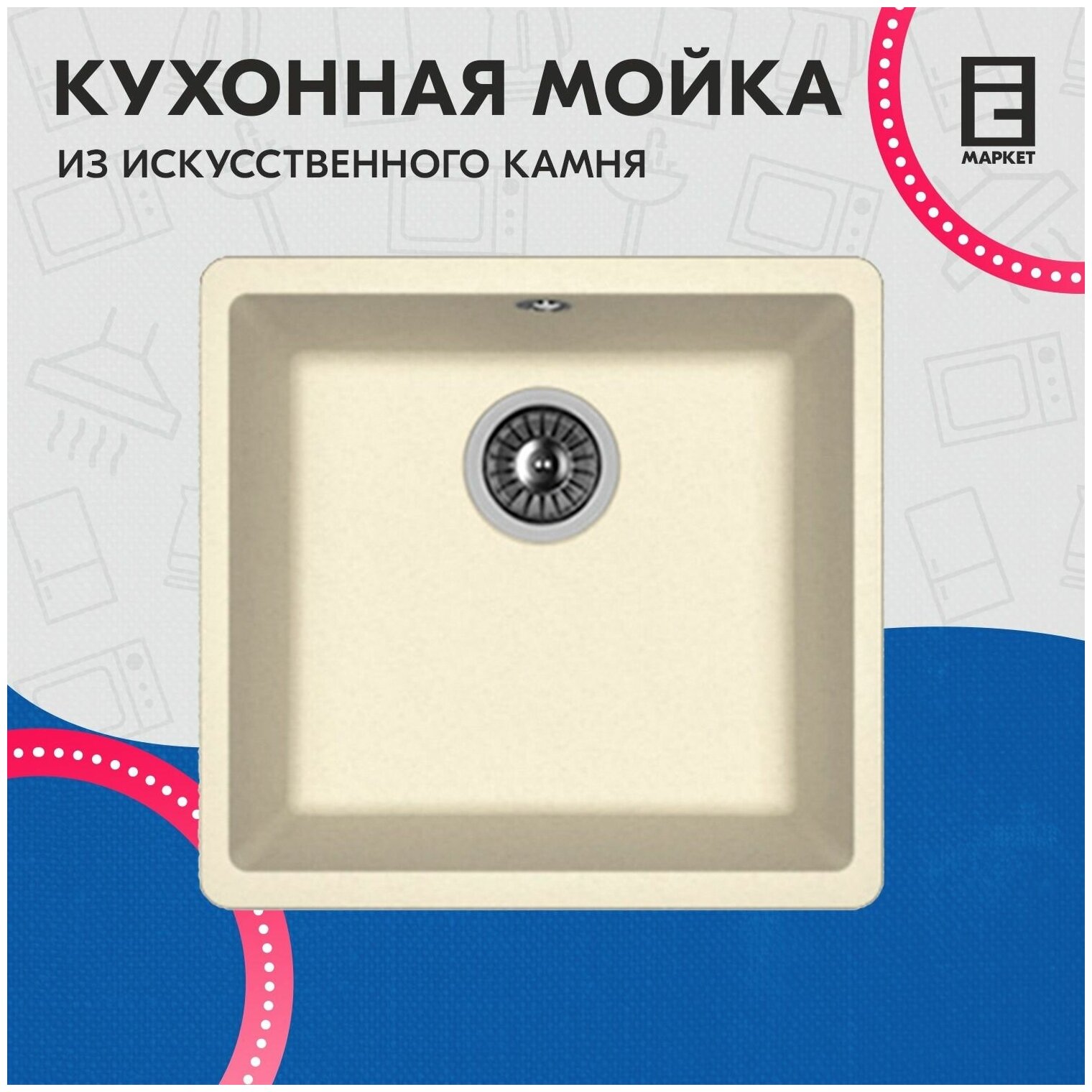 корзинчатый вентиль, отверстие под смеситель, сливная арматура, В комплект входит отводная арматура с выпуском 3 1/2" (D=90мм) и переливом, мойка, набор крепежей и трафарет.