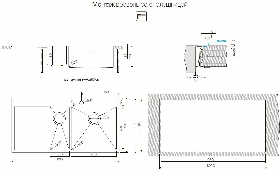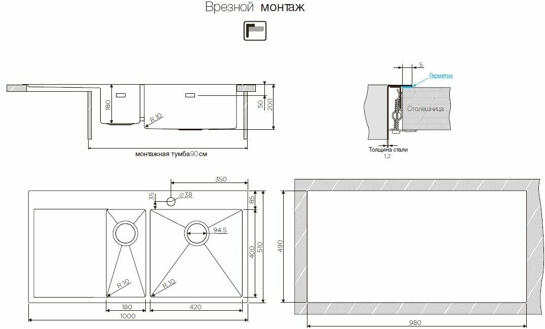 два варианта установки (монтаж вровень со столешницей, монтаж сверху на столешницу), толщина металла 1.2 мм