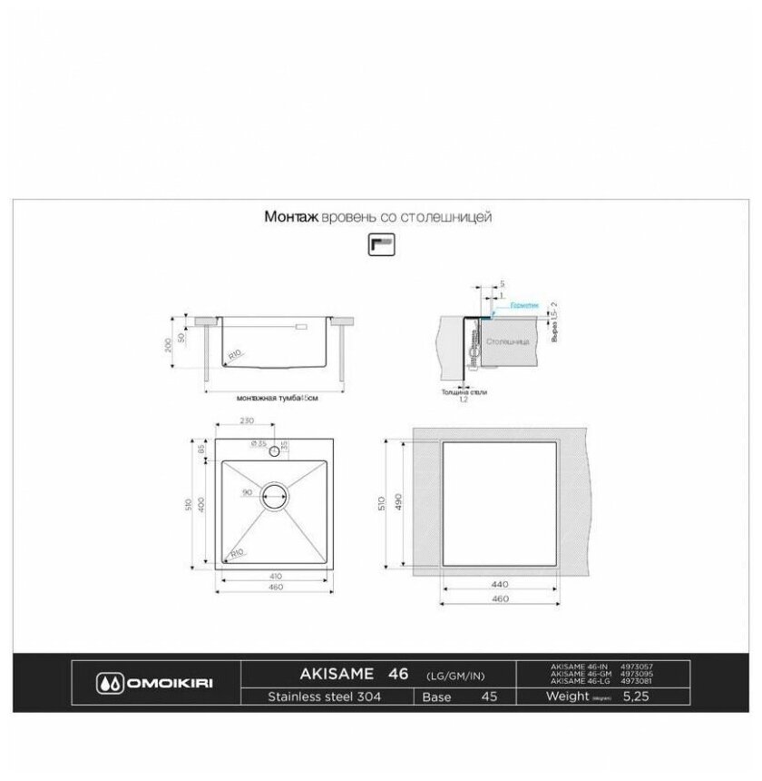 Скачать документы для Мойка Omoikiri Akisame 46-GM вороненая сталь (4973095)