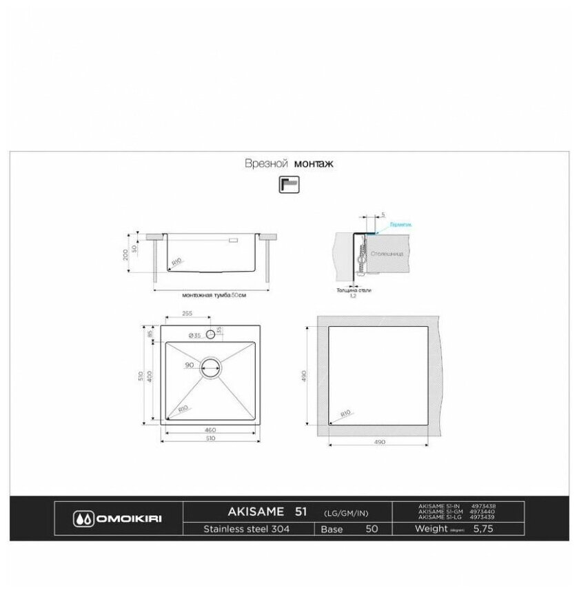 Скачать документы для Мойка Omoikiri Akisame 51-LG нержавеющая сталь/светлое золото 4973439