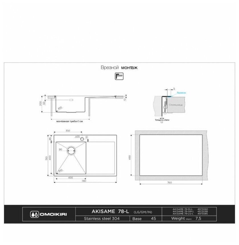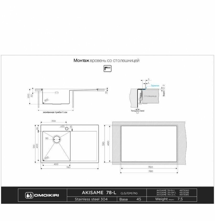 Скачать документы для Мойка Omoikiri Akisame 78-GM-L нержавеющая сталь/вороненая сталь 4973099