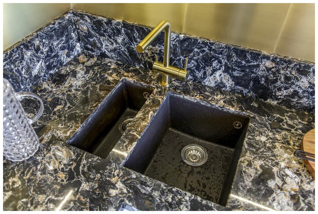 - Кухонная мойка изготовлена из матриала «Tetogranit», технология производства которого заключается в том, что частицы гранита, кварцевый песок и акриловую смолу объединяют в пресс-форме и обжигают при высокой температуре. Далее, для обеззараживания поверхности добавляют ионы серебра и волокна теторона (Tetoron), благодаря которым, на всём протяжении эксплуатации моек не происходит развитие бактерий, плесени и грибка. Также, при изготовлении моек из «Tetogranit» применяется специальный способ окрашивания частиц гранита: на их поверхность при температуре выше 700°С наносится пигмент, который за счет высокотемпературного нанесения проникает во внутренние структуры камня;