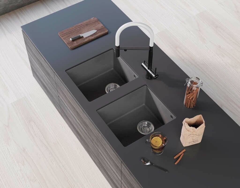 - Кухонная мойка изготовлена из матриала «Tetogranit», технология производства которого заключается в том, что частицы гранита, кварцевый песок и акриловую смолу объединяют в пресс-форме и обжигают при высокой температуре. Далее, для обеззараживания поверхности добавляют ионы серебра и волокна теторона (Tetoron), благодаря которым, на всём протяжении эксплуатации моек не происходит развитие бактерий, плесени и грибка. Также, при изготовлении моек из «Tetogranit» применяется специальный способ окрашивания частиц гранита: на их поверхность при температуре выше 700°С наносится пигмент, который за счет высокотемпературного нанесения проникает во внутренние структуры камня;