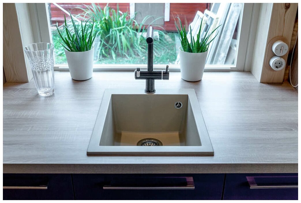 - Материал выдерживает высокие температуры до 280°С (но не стоит ставить на поверхность мойки горячие сковородки и кастрюли, т.к их температура может достигать 500°С).