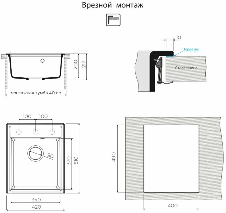 в комплект входит: крепления, донный клапан, сифон; толщина материала мойки: 10 мм; размер выреза под мойку: 490х400 мм