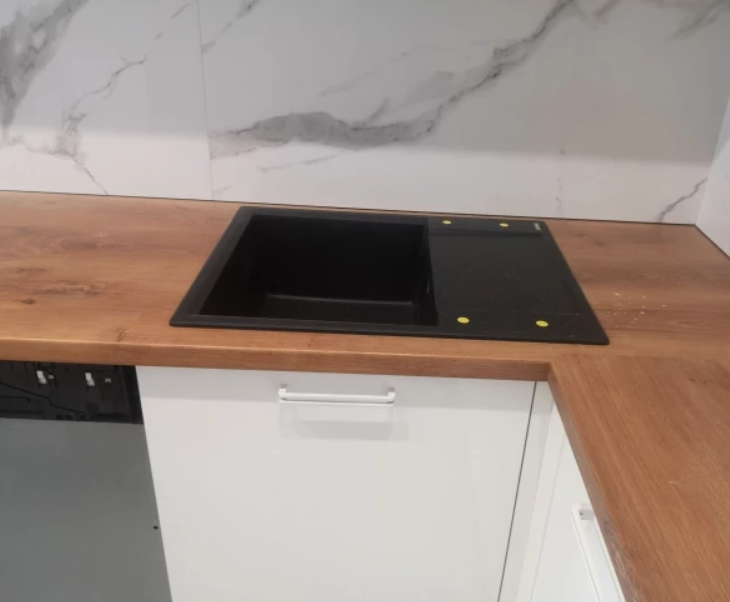 - Кухонная мойка изготовлена из матриала «Artgranit», технология производства которого заключается в том, что частицы кварца, гранита и прочного связующего полимера нового поколения, свойства которого похожи на акриловую смолу, соединяют вместе и помещают в форму. После застывания получается готовая мойка;