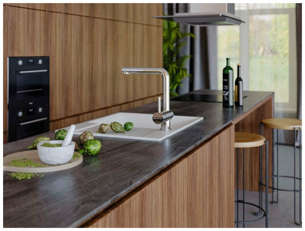 - Кухонная мойка изготовлена из матриала «Artgranit», технология производства которого заключается в том, что частицы кварца, гранита и прочного связующего полимера нового поколения, свойства которого похожи на акриловую смолу, соединяют вместе и помещают в форму. После застывания получается готовая мойка;