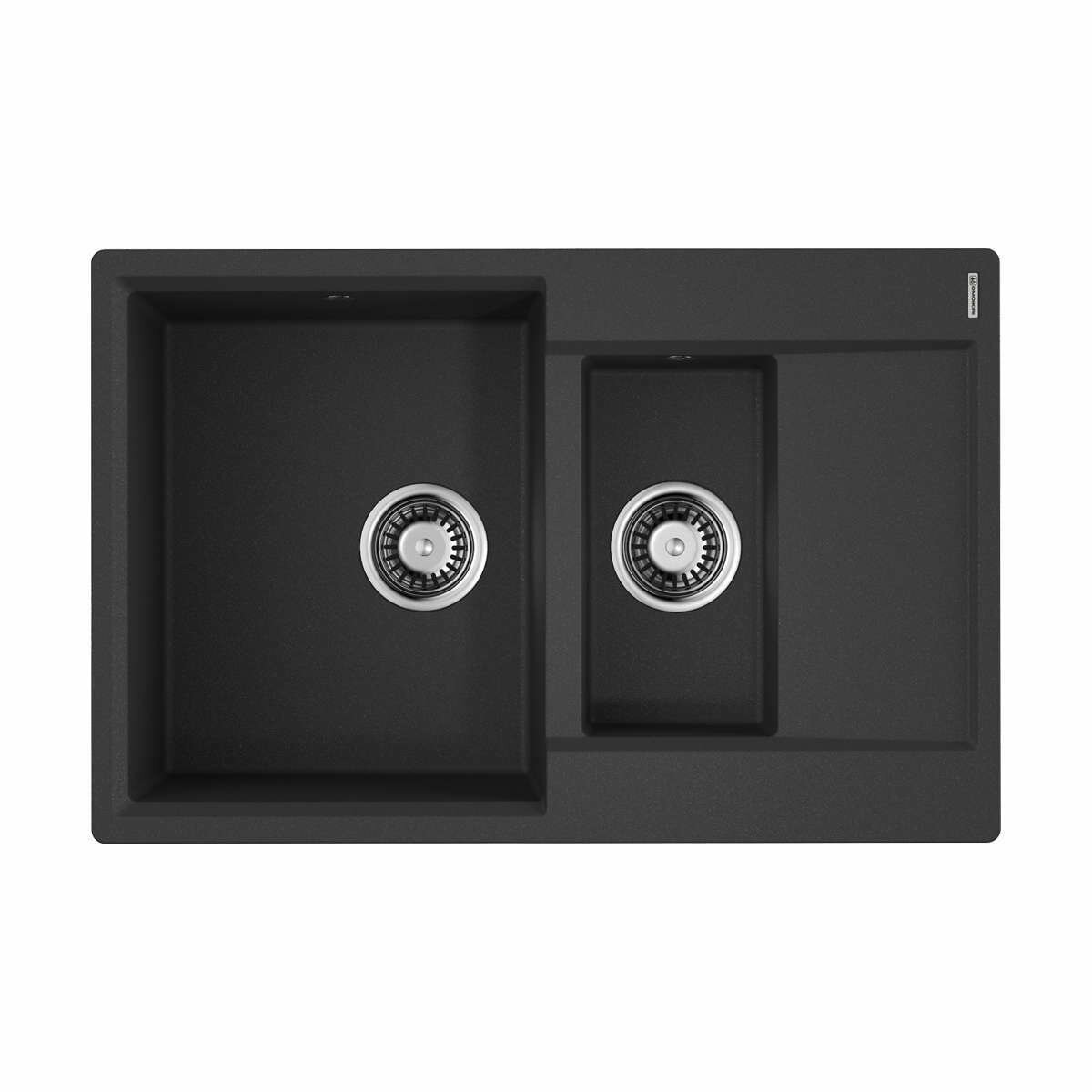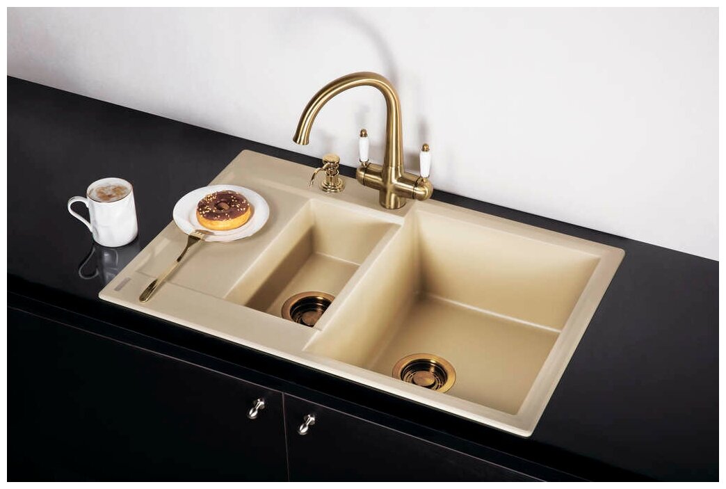 - Кухонная мойка изготовлена из матриала «Artgranit», технология производства которого заключается в том, что частицы кварца, гранита и прочного связующего полимера нового поколения, свойства которого похожи на акриловую смолу, соединяют вместе и помещают в форму. После застывания получается готовая мойка;
