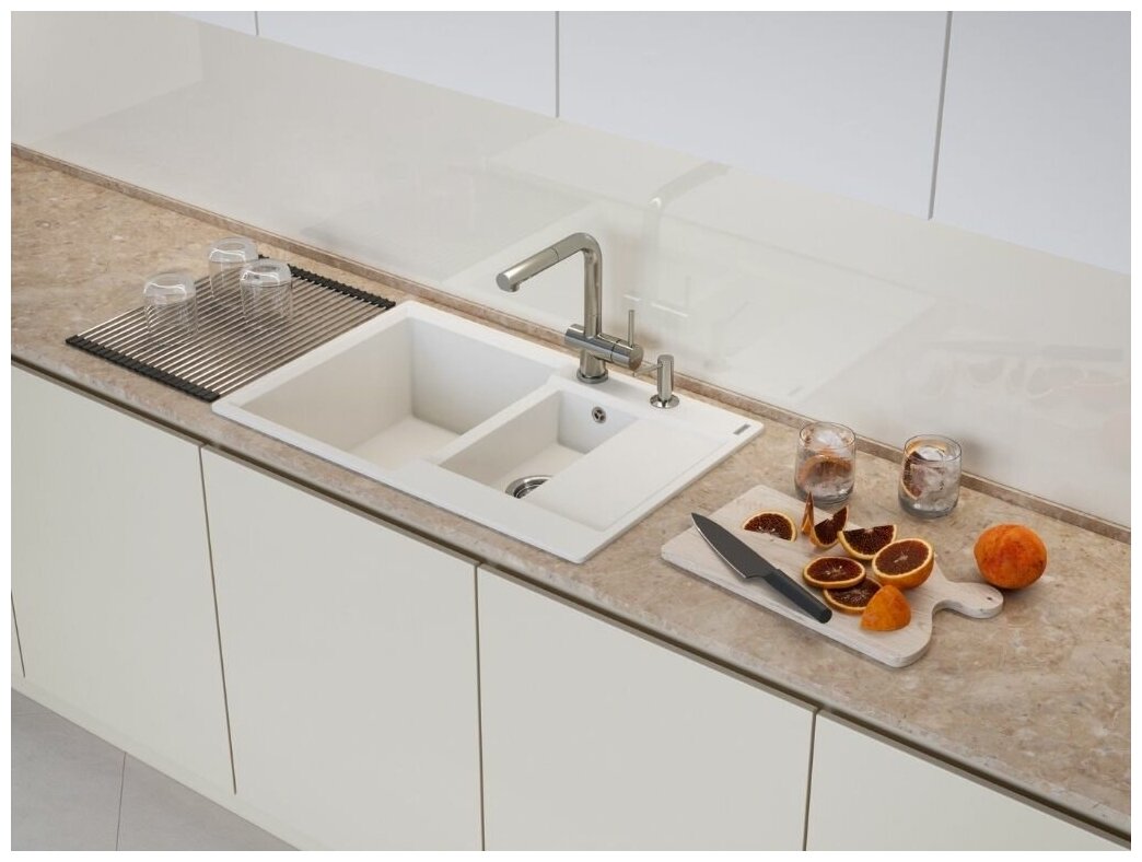 - Помимо гранита, в состав материала входит молотый кварц мельчайших размеров, которому характерны непревзойденная прочность и устойчивость к природным и химическим воздействиям. Свойства данного компонента вместе с долговечностью гранита обеспечивают мойке прочность и делают её устойчивой к любым механическим повреждениям: деформациям, сколам;
