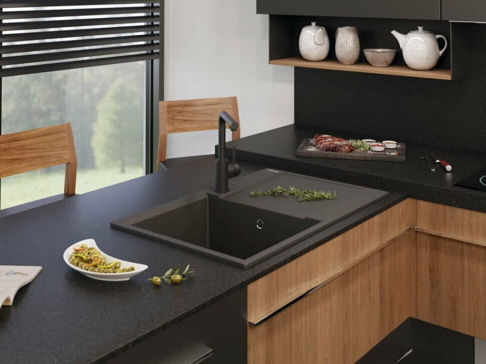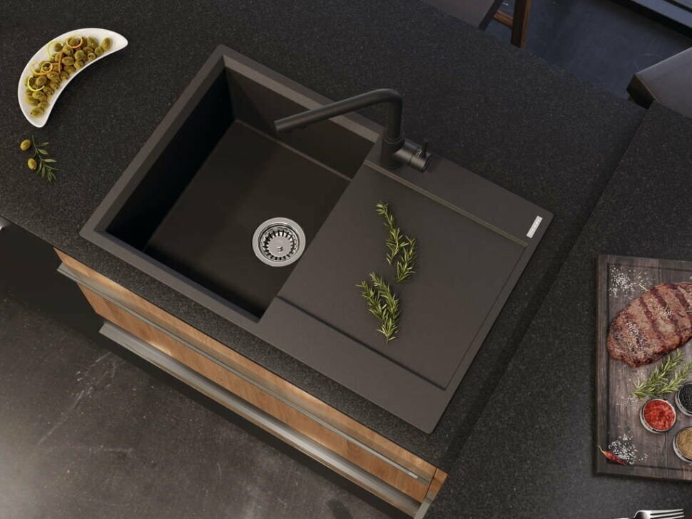 - Кухонная мойка изготовлена из матриала «Artgranit», технология производства которого заключается в том, что частицы кварца, гранита и прочного связующего полимера нового поколения, свойства которого похожи на акриловую смолу, соединяют вместе и помещают в форму. После застывания получается готовая мойка;